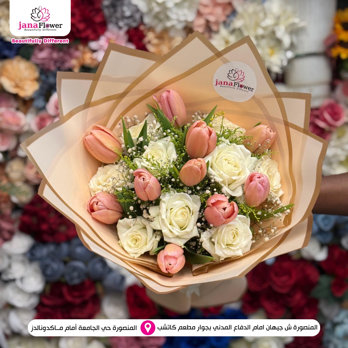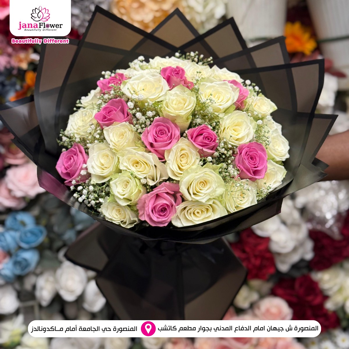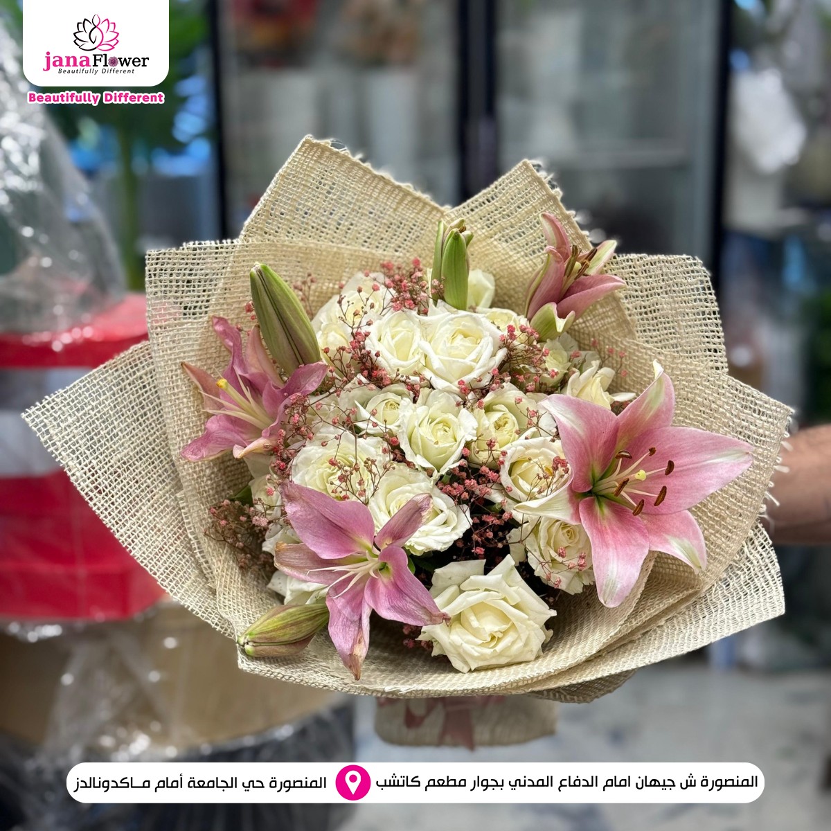 الخبرة في تجهيز الزهور واضحة في كل شغل بيطلع من Jana Flower، من اختيار الورد لحد التنسيق النهائي. كل خطوة بتتعمل باهتمام علشان النتيجة تكون باقة مرتبة تعبر عن المناسبة بشكل واضح وبسيط.