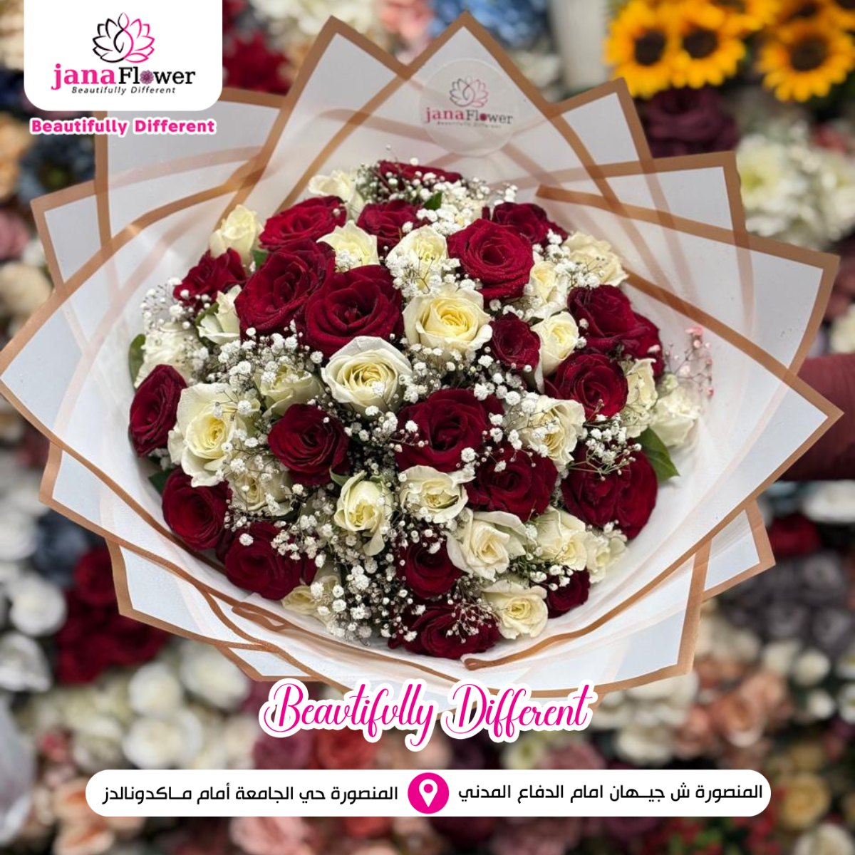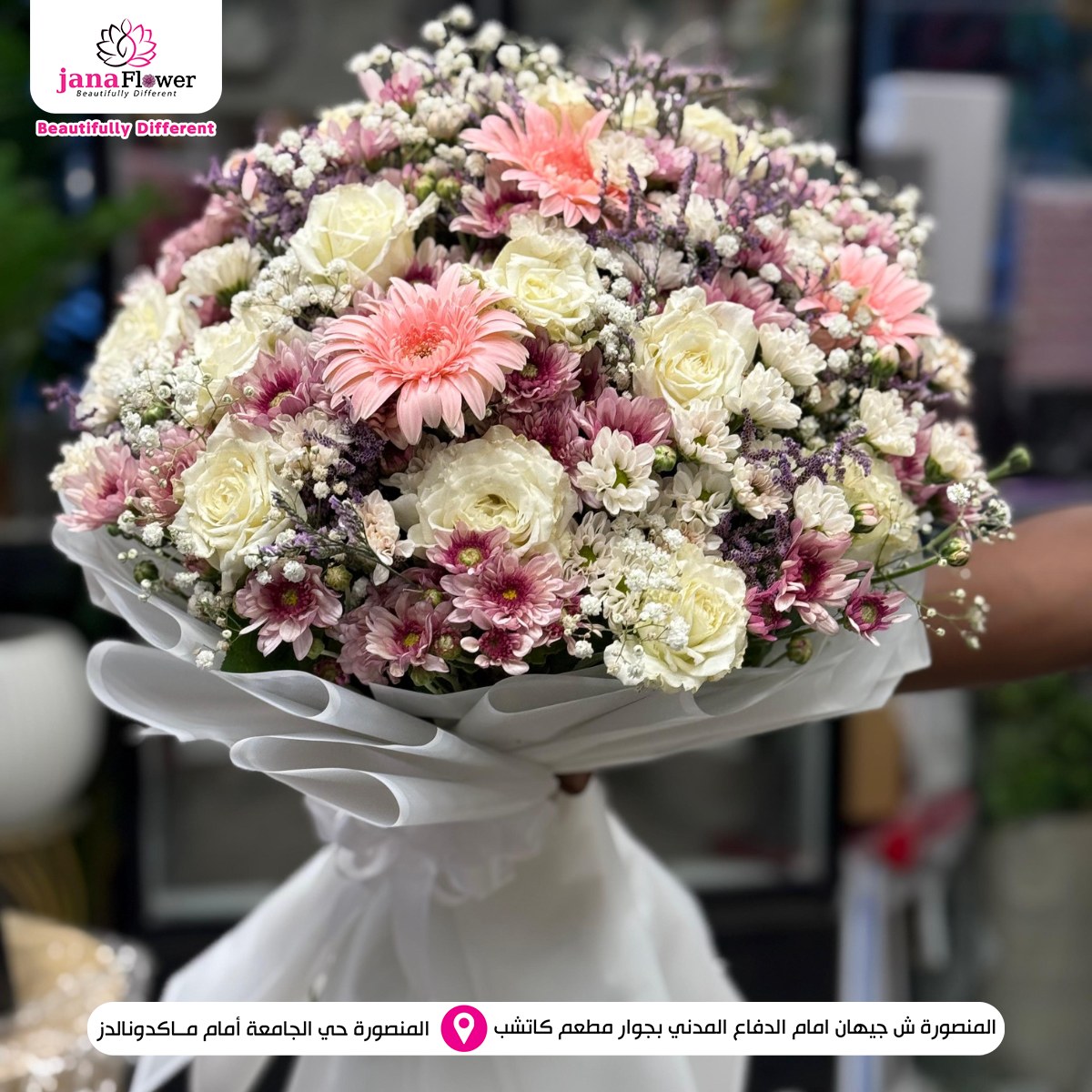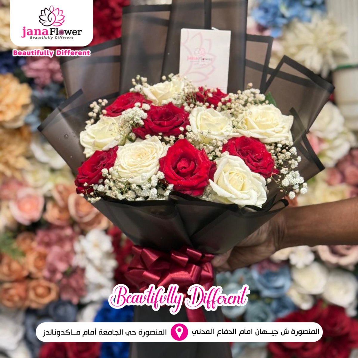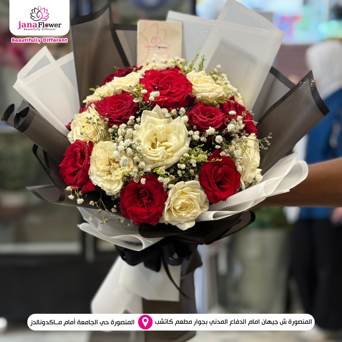 الخبرة في تجهيز الزهور واضحة في كل شغل بيطلع من Jana Flower، من اختيار الورد لحد التنسيق النهائي. كل خطوة بتتعمل باهتمام علشان النتيجة تكون باقة مرتبة تعبر عن المناسبة بشكل واضح وبسيط.