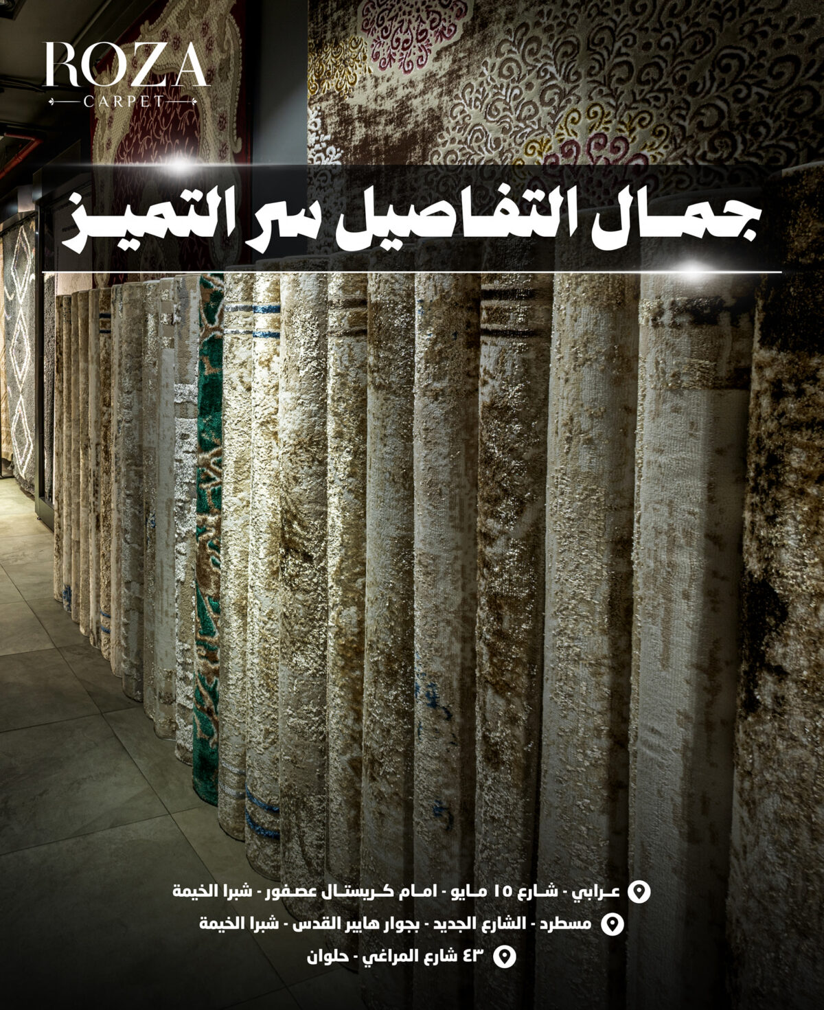 أول ما تدخل Roza Carpet بتحس إن الألوان معروضة بطريقة مريحة للعين، وكل قطعة ليها شخصية مختلفة، سواء كانت درجات هادية تناسب الشقق المودرن أو ألوان دافئة تمشي مع الريسبشن الكبير. التصميمات هناك مش متكررة، وده بيخلي كل حد يحس إن القطعة اللي اختارها مش شبه أي حاجة تانية، وده مهم جدًا خصوصًا للعرايس اللي عايزين يعملوا لمسة مميزة في البيت من غير ما يكون الشكل مفروض عليهم.