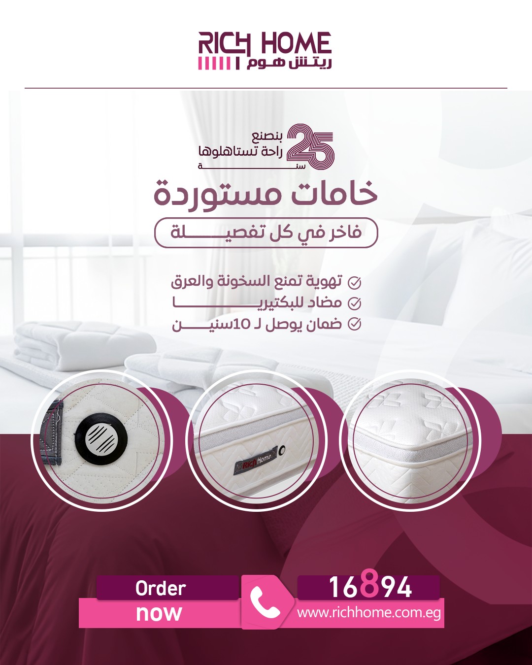 وبالنسبة للضمان، Rich Home Egypt بيوفر ضمان على المراتب حسب كل موديل، وده بيدي إحساس بالثقة إن المرتبة معمولة بخامة محترمة وهتعيش فترة طويلة من غير مشاكل. الضمان بيغطّي عيوب التصنيع وده بيطمن أي حد بيبدأ حياته وعايز حاجة تستحمل الاستخدام اليومي.