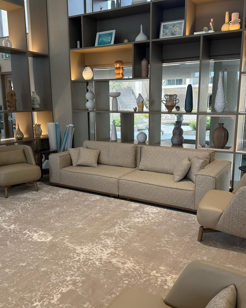 أول ما تدخل المكان بتلاحظ إن القطع النسجية معروضة بطريقة منظمة تخليك تشوف كل موديل بوضوح. في ألوان هادية تناسب غرف النوم وتدي إحساس بالراحة، وفي درجات أغمق تناسب الريسبشن وتضيف للمكان شكل أنيق ودافي. وفي موديلات فيها دمج بين أكتر من درجة لون بشكل بسيط يخلي الغرفة شكلها متوازن ومريح للعين من غير ما تبقى الرسومات كتير أو معقدة.