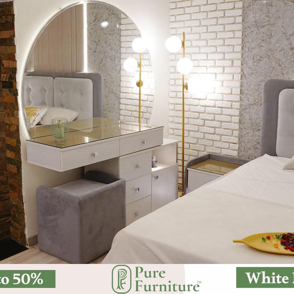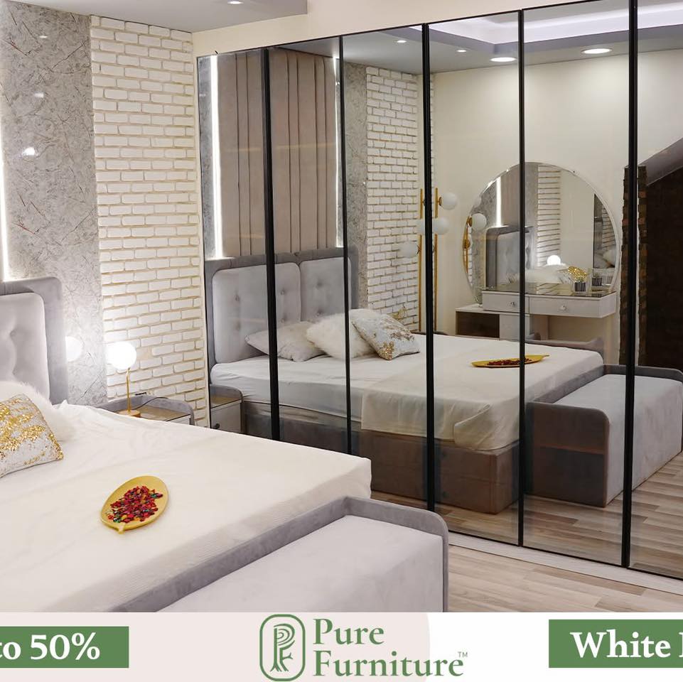 وكمان Pure Furniture بيدّي ضمان على القطع اللي بيقدمها، وده بيدي للعريس والعروسة إحساس بالأمان إن الأثاث مش بس شكله شيك لكنه كمان مضمونة جودته ويعيش سنين.