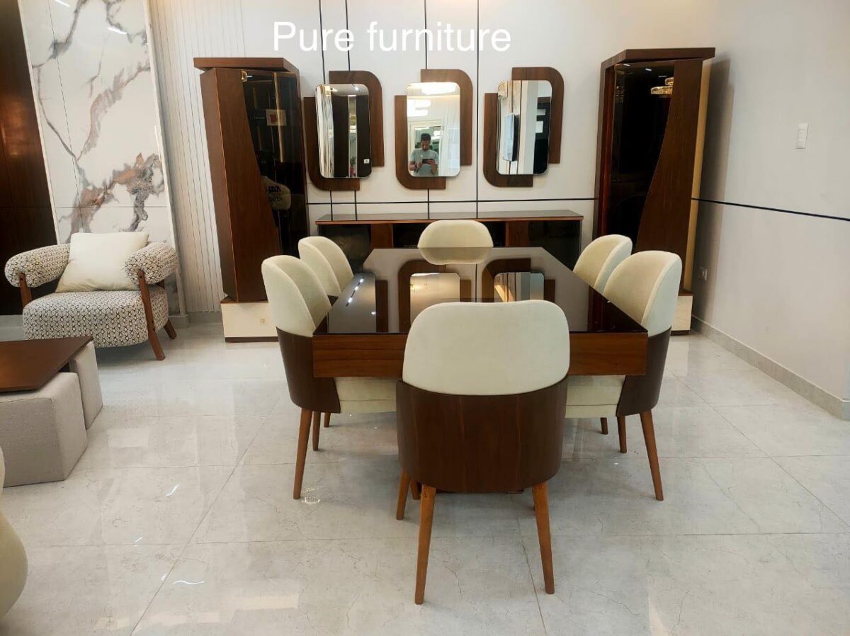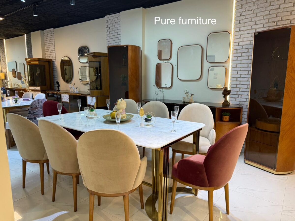 أما السفرة عند Pure Furniture ففعلاً تبان عليها الجودة من أول نظرة. الترابيزة خشبها قوي ومستقر، التشطيب نضيف جداً، والكراسي مريحة وتنجيدها شيك يناسب الاستخدام اليومي. الموديلات عندهم مودرن وفي نفس الوقت مش تقيلة على المكان، وده بيسهّل دمجها مع باقي الديكور سواء ديكور بسيط أو شوية كلاسيكي. فيه موديلات صغيرة تناسب الشقق المساحتها محدودة، وموديلات أكبر للشقق الواسعة.
