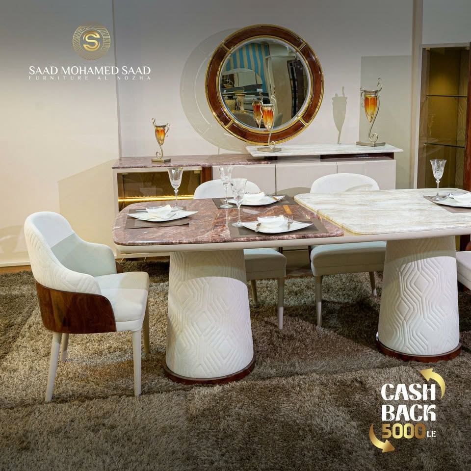 السفرة كمان من الحاجات اللي Saad Mohamed Saad بيقدّمها بشكل شيك. الترابيزة خشبها متين، والكراسي مريحة والتنجيد محسوب بعناية. الموديلات مودرن بخطوط بسيطة تناسب الشقق الصغيرة والمتوسطة، وفي نفس الوقت شكلها أنيق وتدي للبيت لمسة فخامة من غير ما تكون مبالغ فيها.