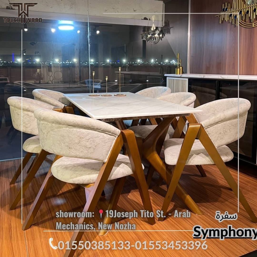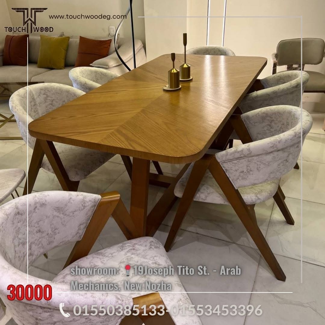 السفرة عند Touch Wood كمان عليها شغل واضح. الترابيزة خشبها قوي ومستقر، التشطيب نضيف ومتعوب عليه، والكراسي مريحة وتنجيدها نضيف. التصميمات مودرن بخطوط بسيطة، وفي نفس الوقت فيها لمسة خشبية دافية تخلي شكل المكان مختلف. سواء بدور على سفرة صغيرة أو كبيرة، هتلاقي موديلات تناسب المساحة وتدي للبيت شكل منظم ومريح.