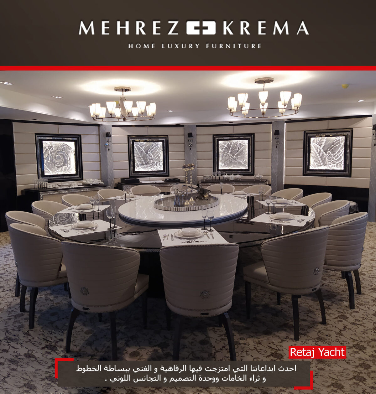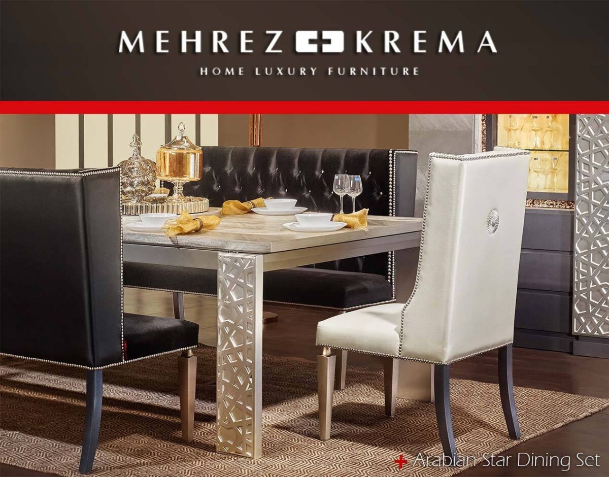 السفرة عند Mehrez + Krema برضه معمولة بفكر عملي وشكل شيك. الترابيزة خشبها قوي وتشطيبها باين إنه معموله بإيد محترفة، والكراسي مريحة وتنجيدها رايق يناسب الاستخدام اليومي. فيه موديلات تناسب المساحات الصغيرة، وموديلات أكبر للمكان الواسع، وكلها بتدي شكل متناسق مع باقي ديكور البيت.