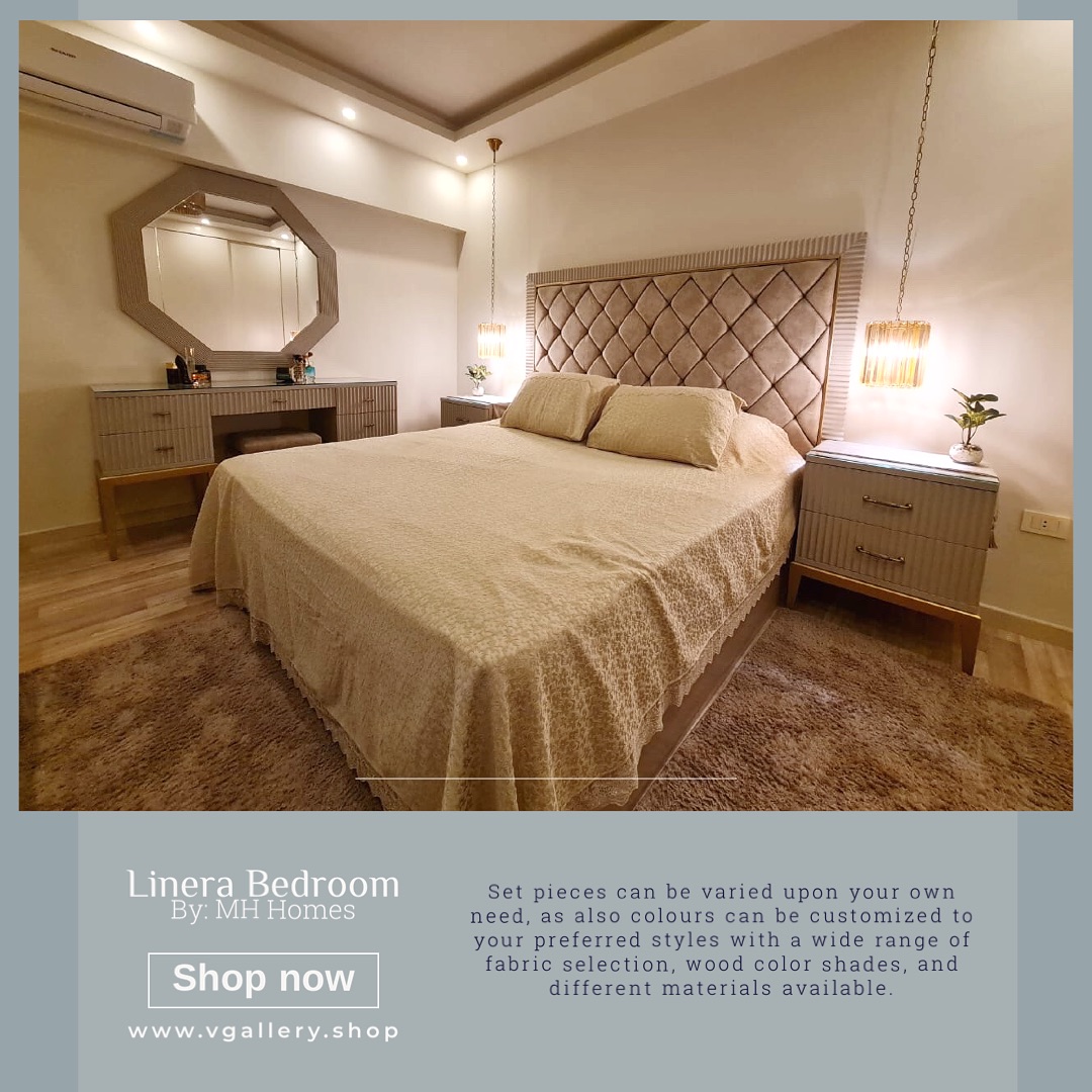 اللي بيميز V Gallery إن التصميمات عندهم فيها لمسة ديزاين واضحة، يعني القطعة شكلها رايق ومودرن بس في نفس الوقت ليها شخصية خاصة. في أوض النوم هتلاقي سراير بخطوط أنيقة وهادية، خشب متين وتشطيب نضيف، والدولايب متقسمة بشكل عملي سواء جرار أو مفصلات. التقسيم جوه الدولاب معمول بفكر يستغل كل رف وكل مساحة، وده بيريّح العرسان جداً خصوصاً لو الشقة مساحتها صغيرة.