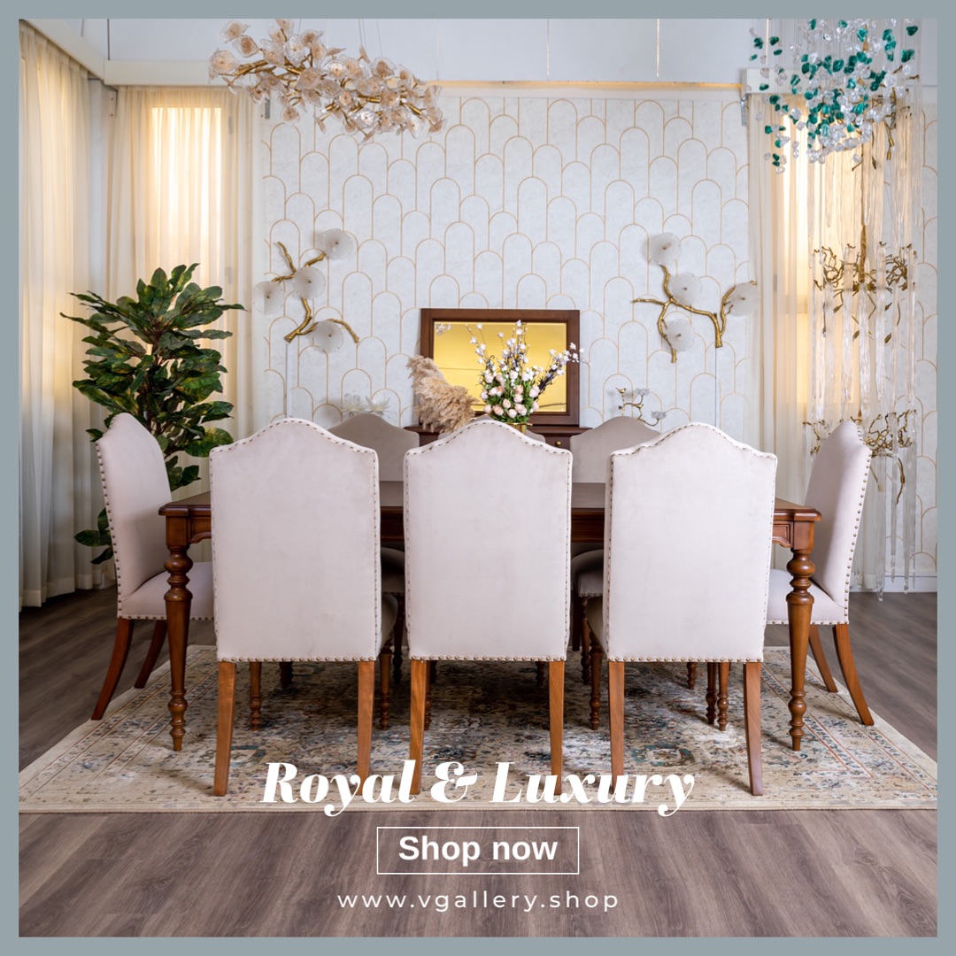 السفرة عند V Gallery كمان ليها حضور قوي. الترابيزة خشبها قوي وثابت، والتشطيب باين عليه إنه معمول بإيد محترف. الكراسي مريحة، وتنجيدها نضيف، والتصميم كله بسيط لكنه راقي. سواء بدور على سفرة صغيرة للمساحات المحدودة أو سفرة كبيرة للريسبشن، هتلاقي موديلات مناسبة وشكلها شيك من غير ما تكون تقيلة على العين.