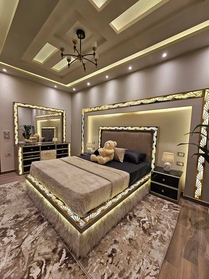 في غرف النوم، هتلاقي سراير بتصميمات مودرن خفيفة، بتدي إحساس بالهدوء والراحة، والدولايب هناك فيها تقسيمات ذكية، سواء جرّارات أو أبواب عادية، وكلها معمولة من خامات كويسة تدّي عمر طويل. كمان التسريحات والكومودينات متصممة بشكل بسيط وأنيق.