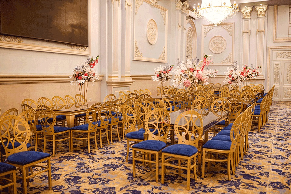 القاعة بتتميز بديكورات فخمة ومساحات كبيرة تناسب استقبال عدد مختلف من الضيوف مع ترتيبات مرنة للطاولات والكراسي حسب طبيعة الحدث