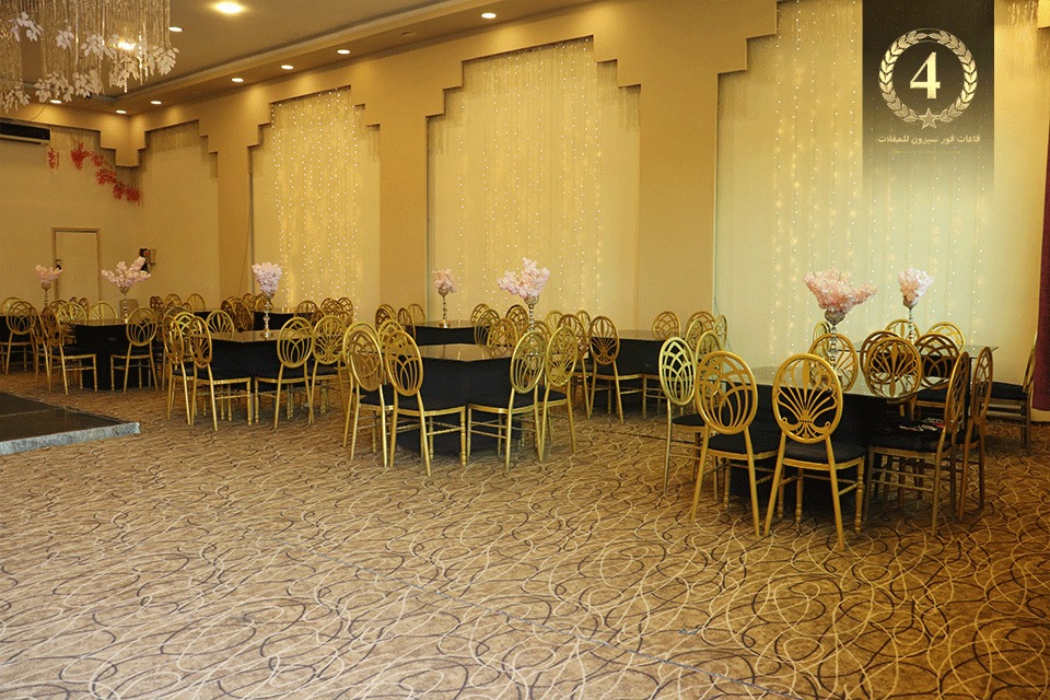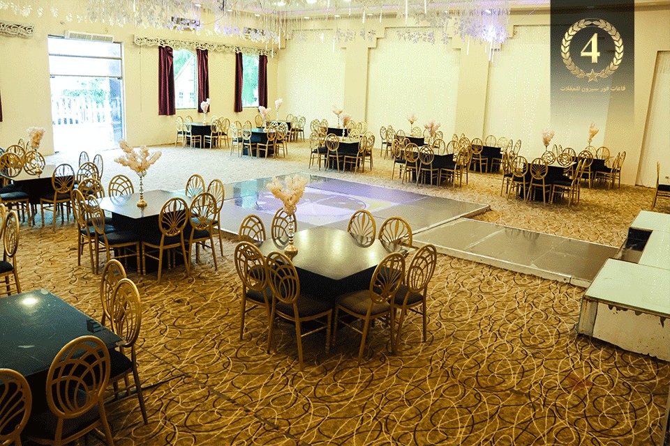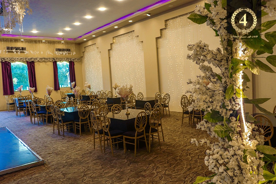 القاعة بتتميز بديكورات فخمة ومساحات كبيرة تناسب استقبال عدد مختلف من الضيوف مع ترتيبات مرنة للطاولات والكراسي حسب طبيعة الحدث