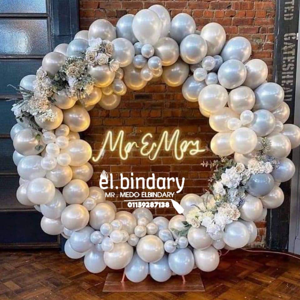 من أول لحظة بتدخل فيها المكان، هتحس بالفرق. البالونات عنده مش مجرد زينة، دي عنصر أساسي في تصميم المشهد كله. بيعرف يشتغل بيها بألوان وأحجام مختلفة، ويشكل منها بوابات، خلفيات للكوشة، سقف كامل من البلالين، أو حتى طاولات مضيئة بالبلالين.