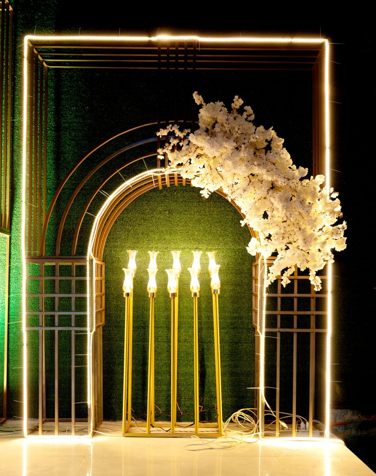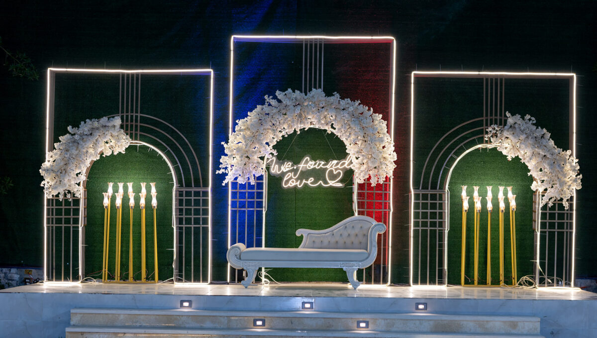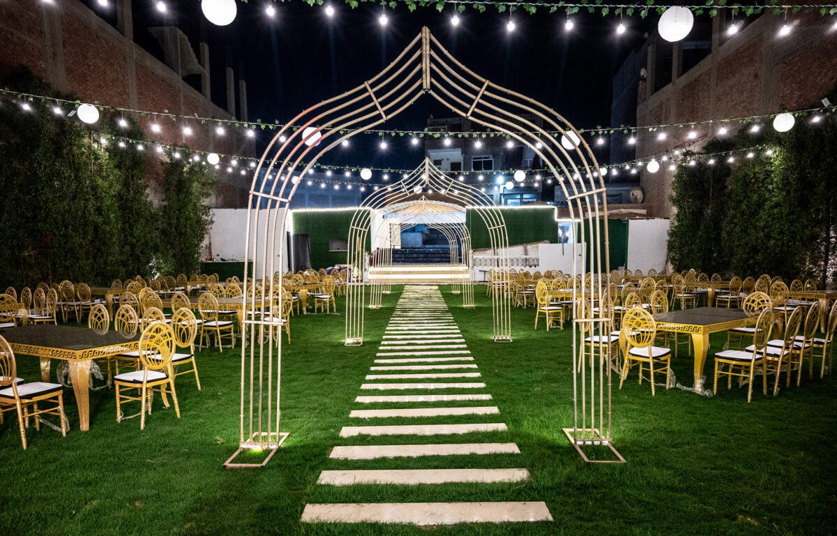 القاعة بتتميز بديكور بسيط وعصري، وسهل جدًا تضيف لمستك الخاصة سواء في الكوشة أو الإضاءة أو الزينة.