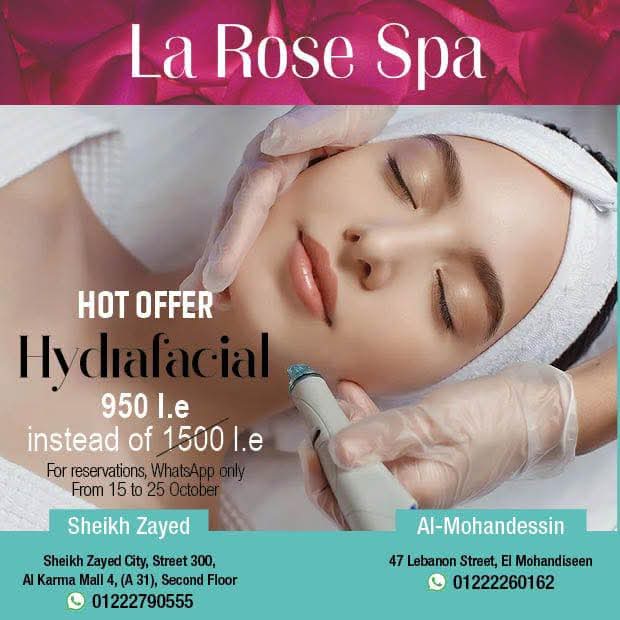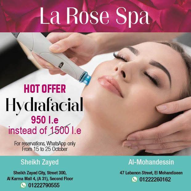 لو بشرتك تعبانة، باهتة، أو محتاجة انتعاش، في La Rose Spa Zayed هتلاقي جلسات تنظيف وعناية احترافية.