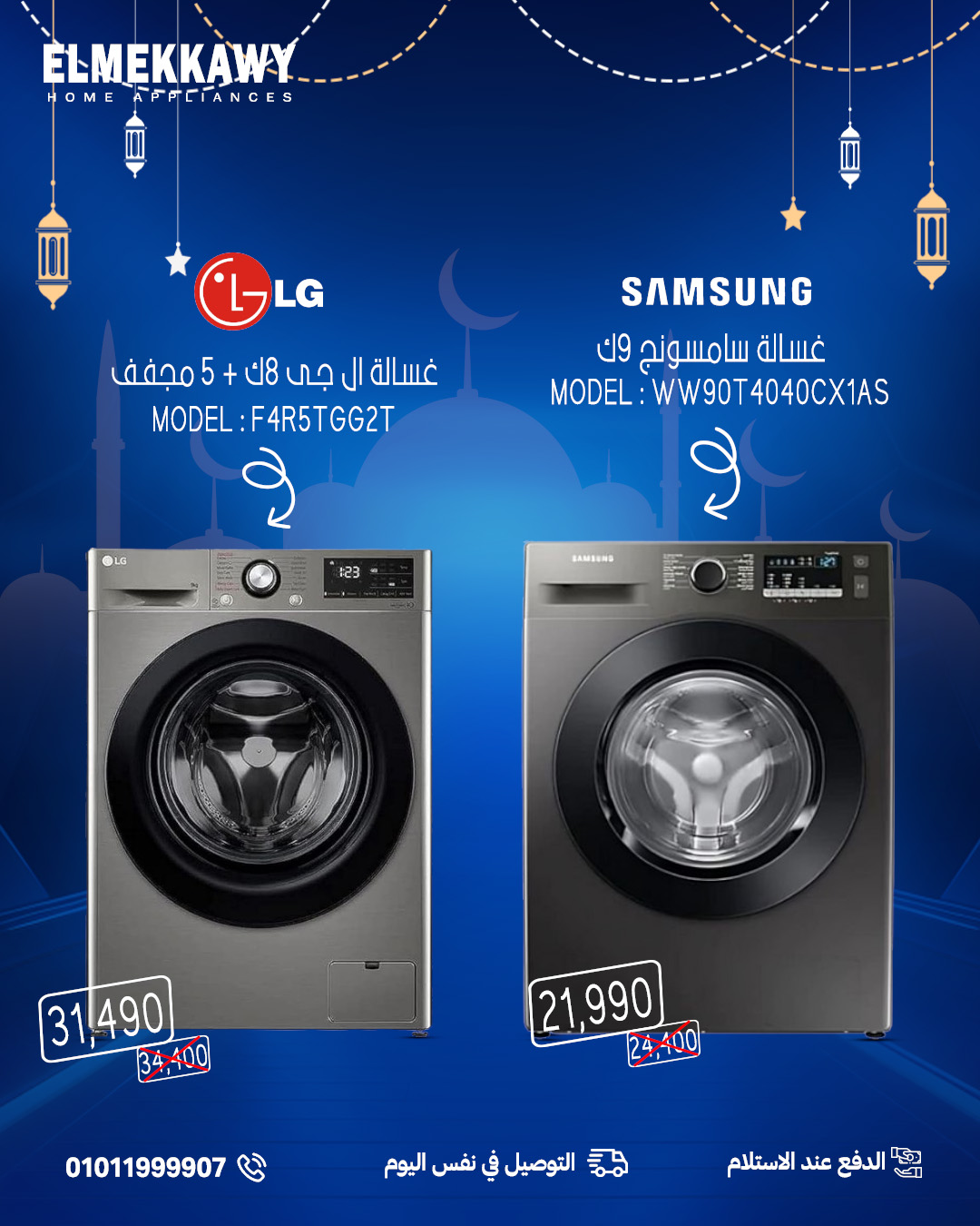 - الغسالات: أوتوماتيك ٧، ٩، ١٢، ١٤ كيلو، وفوق أوتوماتيك بسعات كبيرة مع برامج بخار.