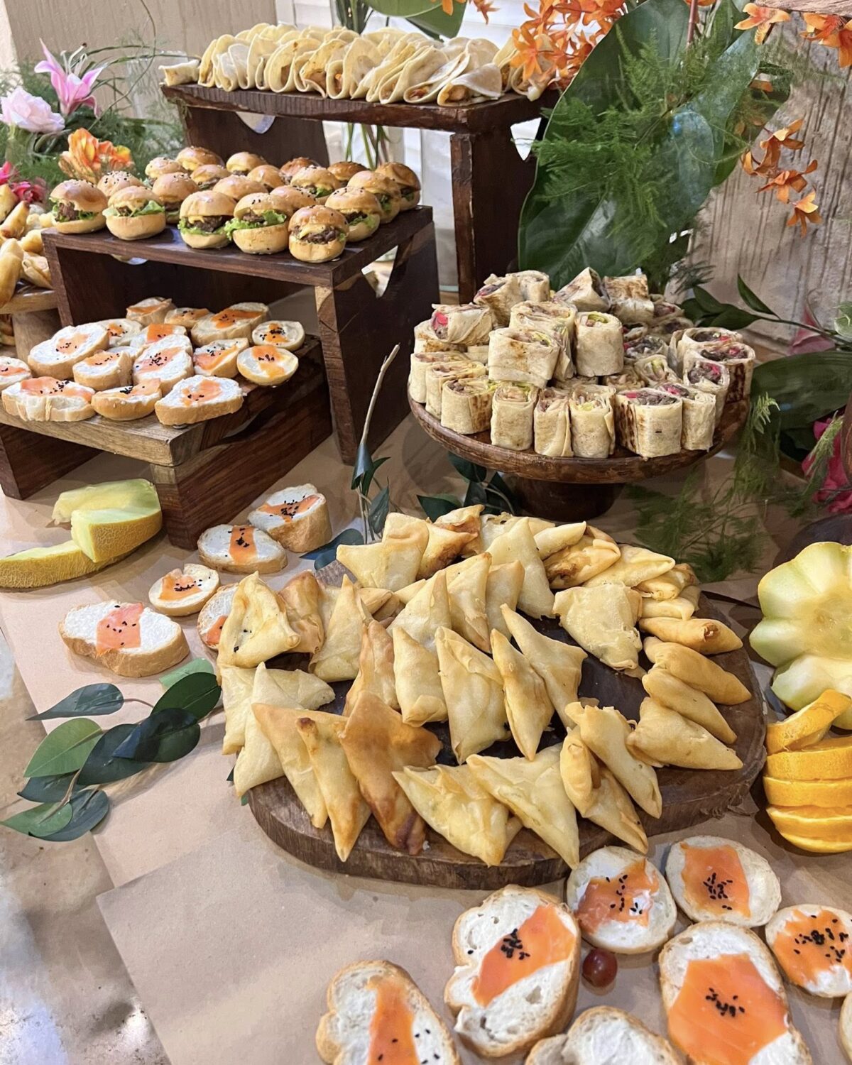 البوفيه بيكون شكله شيك ومنظم، الأطباق متقسمة بطريقة تخلي الضيوف يختاروا بسهولة من غير زحمة. التقديم نفسه جزء من الديكور، بألوان متناسقة وترتيب مريح للعين، وده بيخلي الضيوف يستمتعوا حتى قبل ما يبدأوا الأكل.