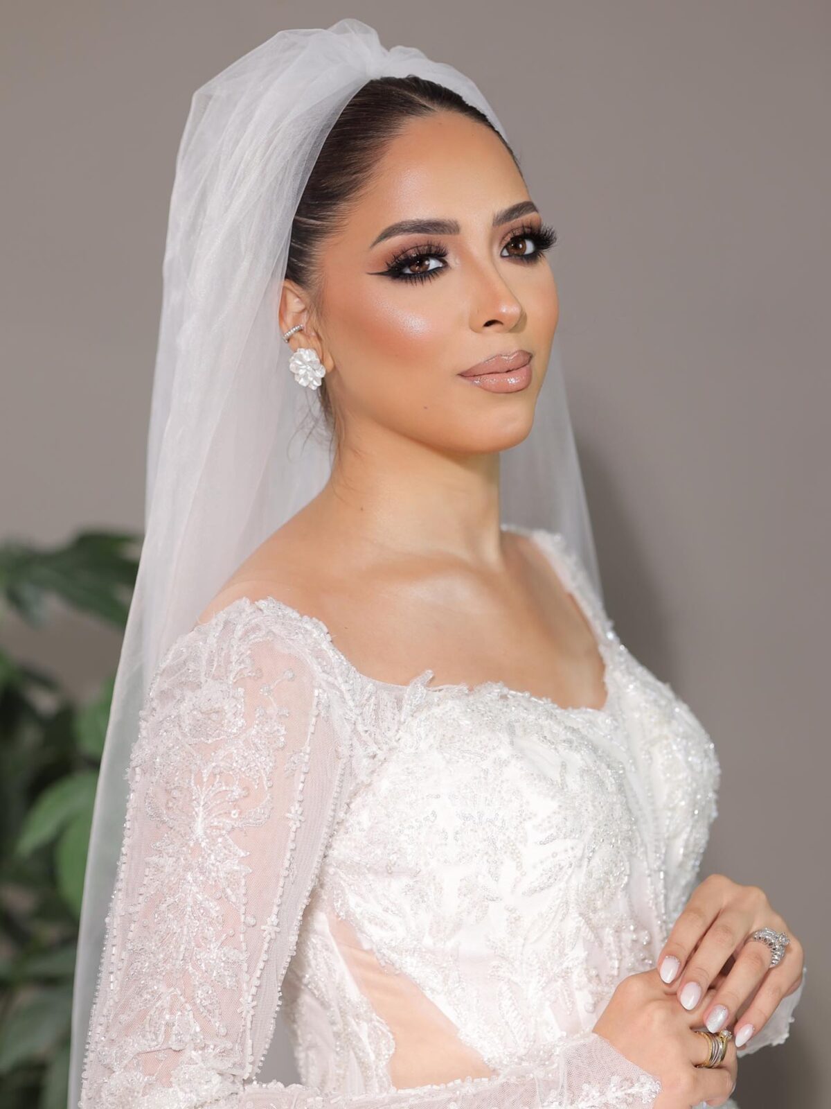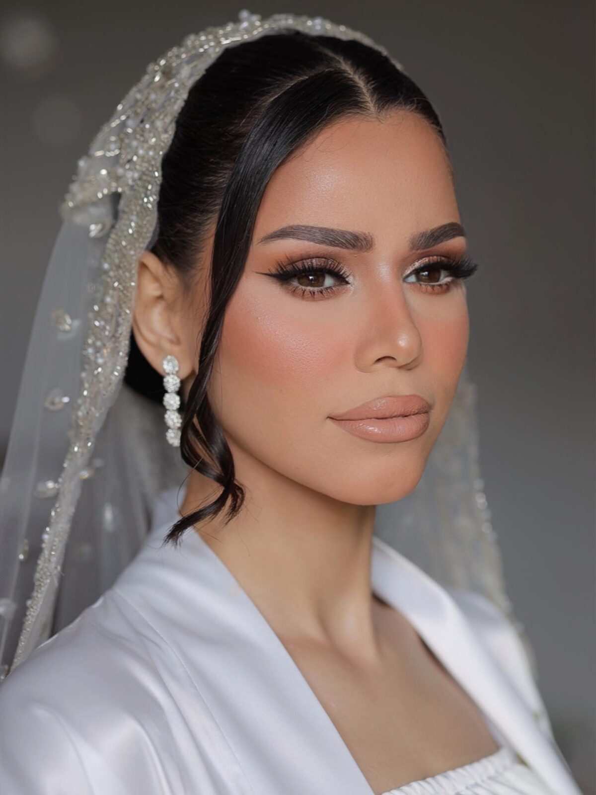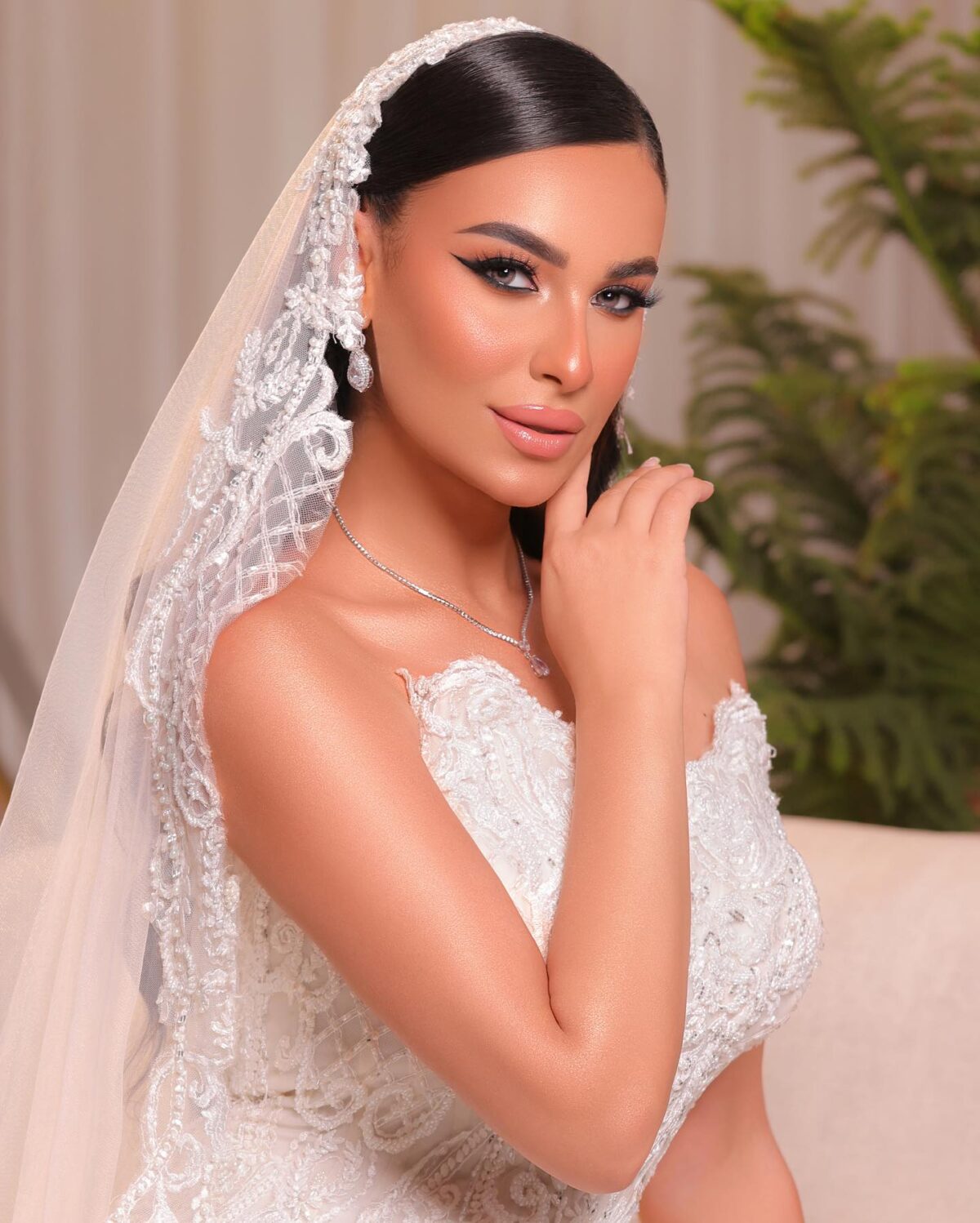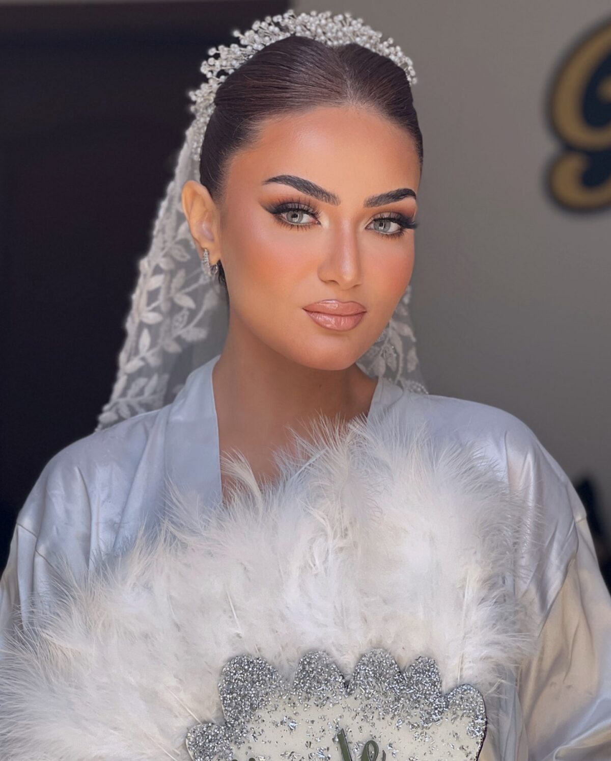 أما لو العروسة حابة لوك جريء شوية، آية بتعرف توازن بين الألوان القوية والنعومة. ممكن تعمل سموكي ناعم بدرجات رمادية أو نحاسية وتختار لون شفايف قوي زي الأحمر أو الفوشيا، لكن دايمًا بتحافظ إن الإطلالة تفضل أنيقة ومتناسقة. عندها حس فني عالي جدًا في توزيع الكونتور والهايلايتر بطريقة تبرز الملامح بخفة وبدون خطوط أو مبالغة.