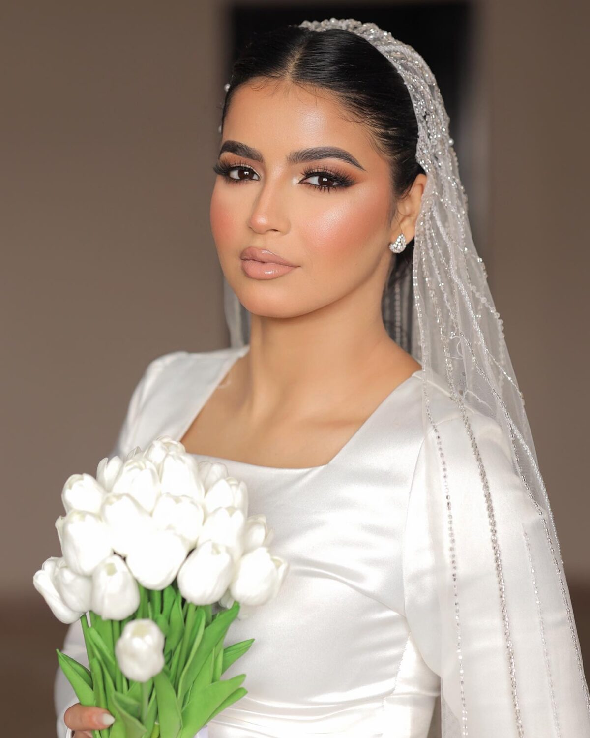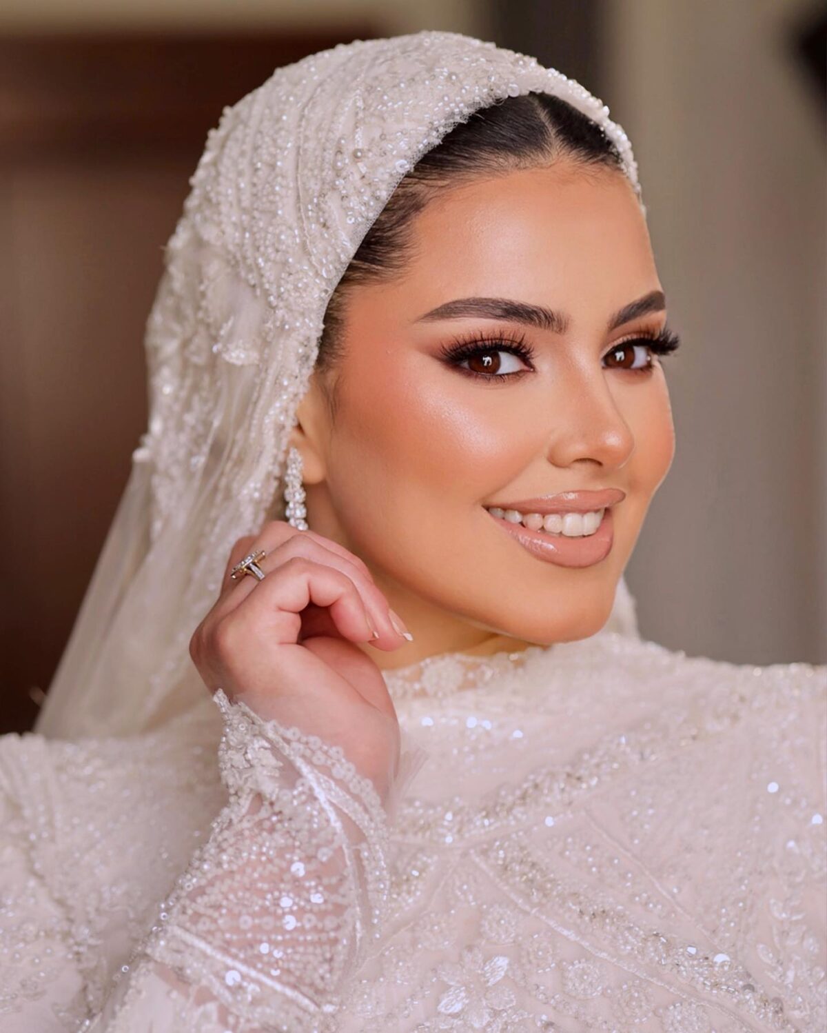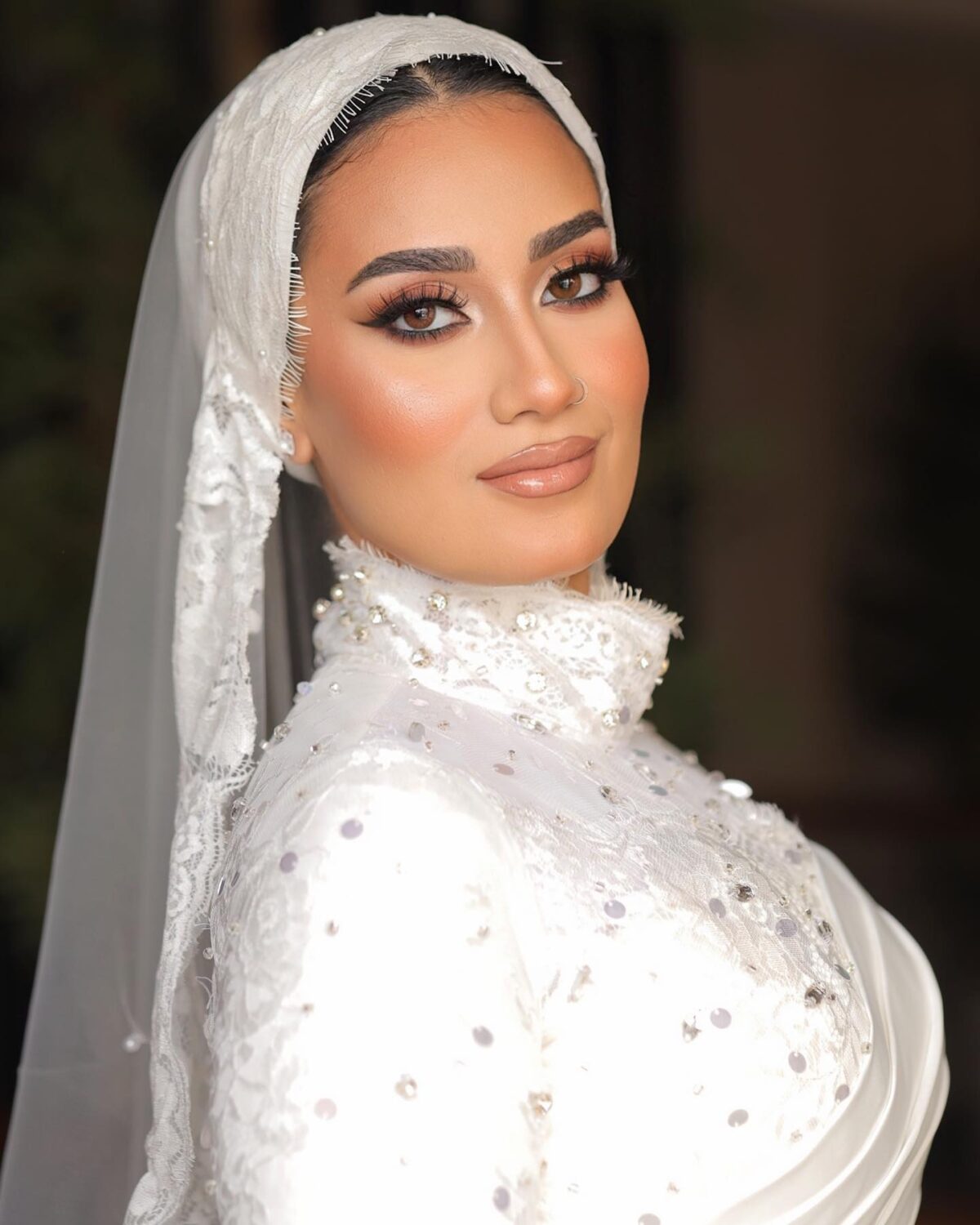 أما لو العروسة حابة لوك جريء شوية، آية بتعرف توازن بين الألوان القوية والنعومة. ممكن تعمل سموكي ناعم بدرجات رمادية أو نحاسية وتختار لون شفايف قوي زي الأحمر أو الفوشيا، لكن دايمًا بتحافظ إن الإطلالة تفضل أنيقة ومتناسقة. عندها حس فني عالي جدًا في توزيع الكونتور والهايلايتر بطريقة تبرز الملامح بخفة وبدون خطوط أو مبالغة.