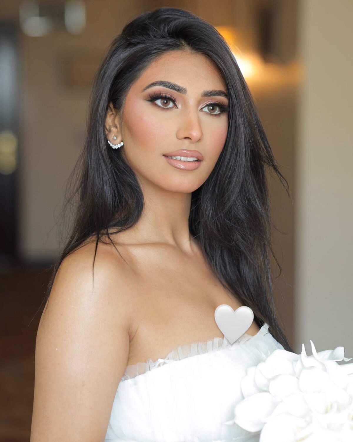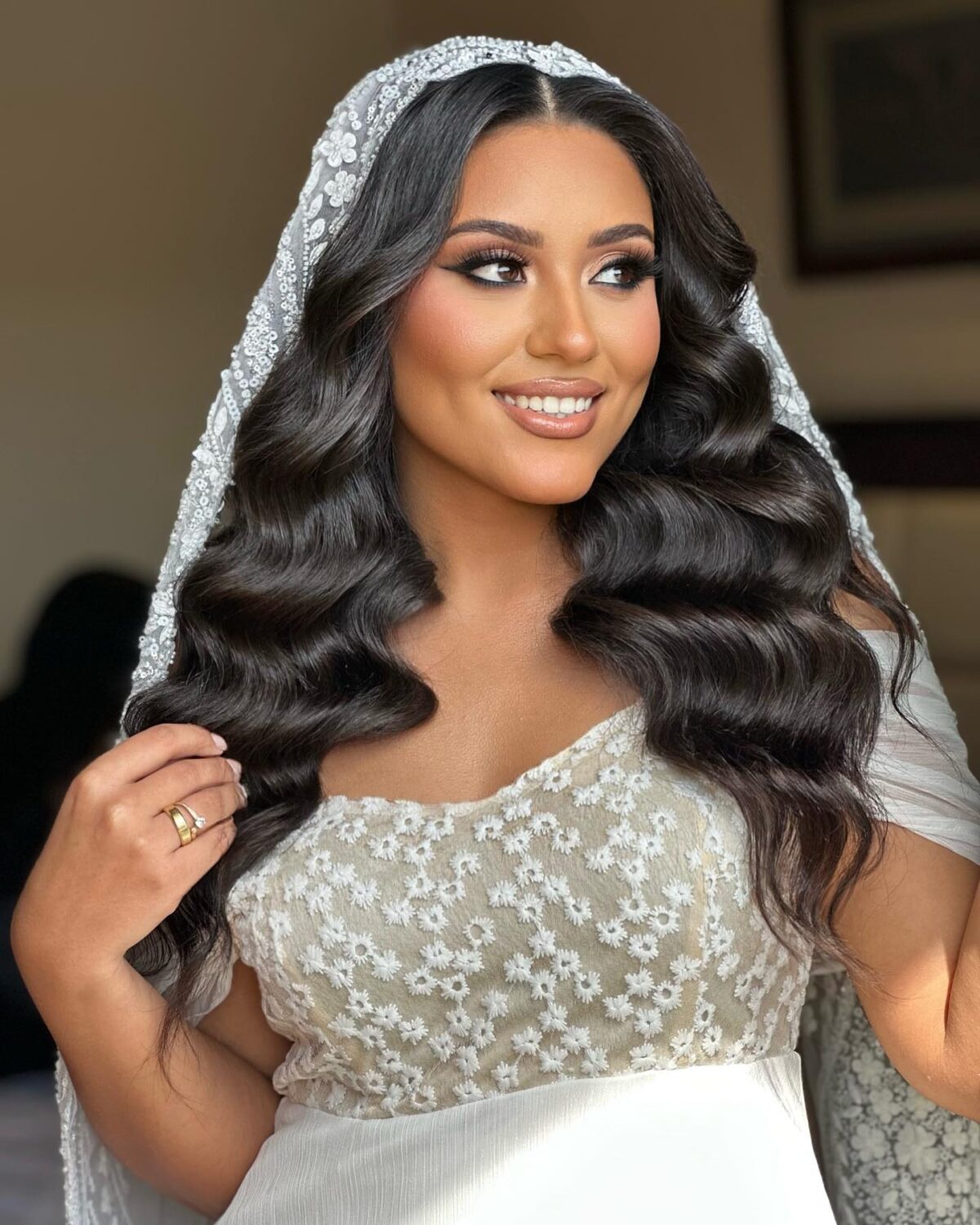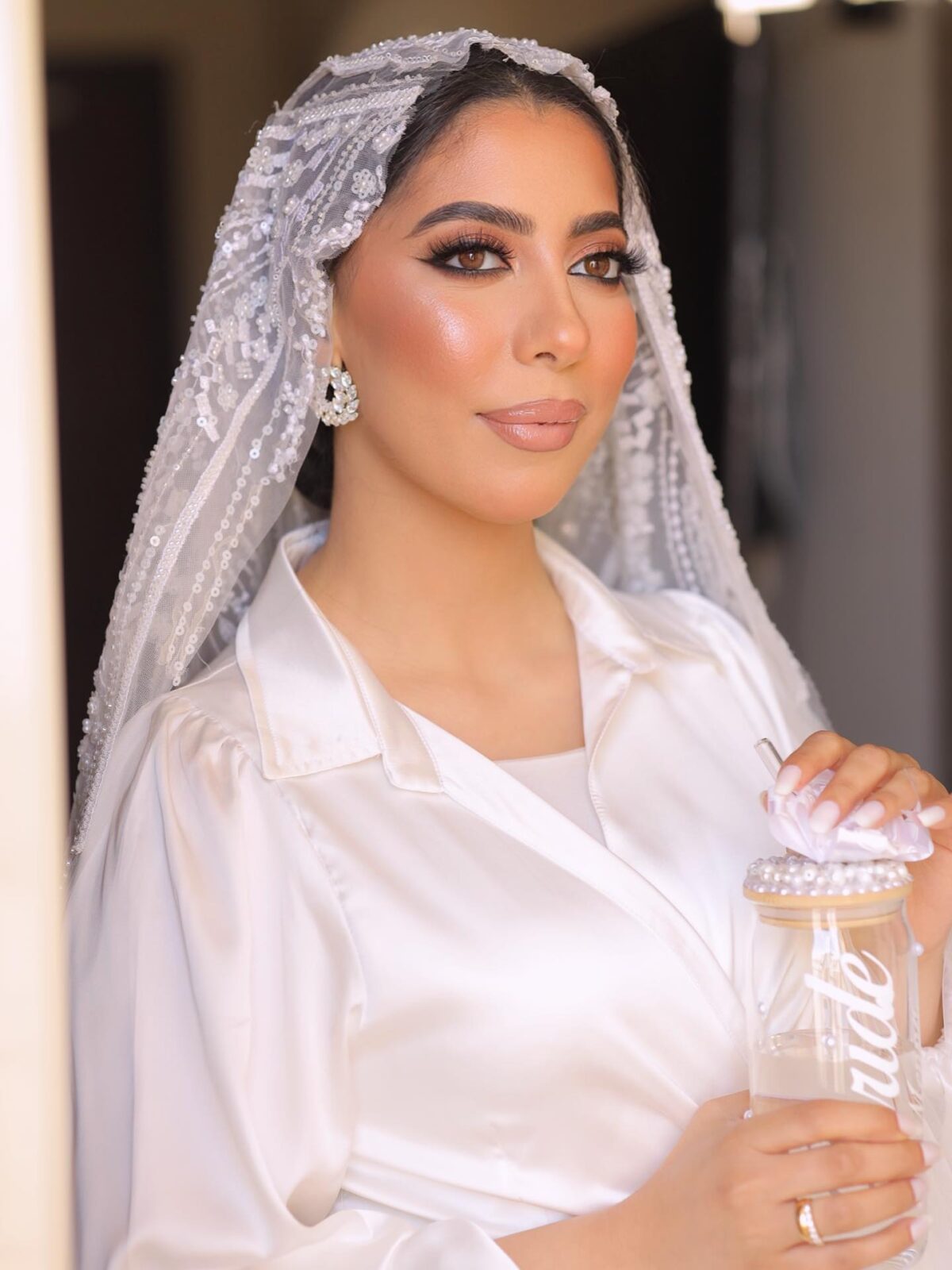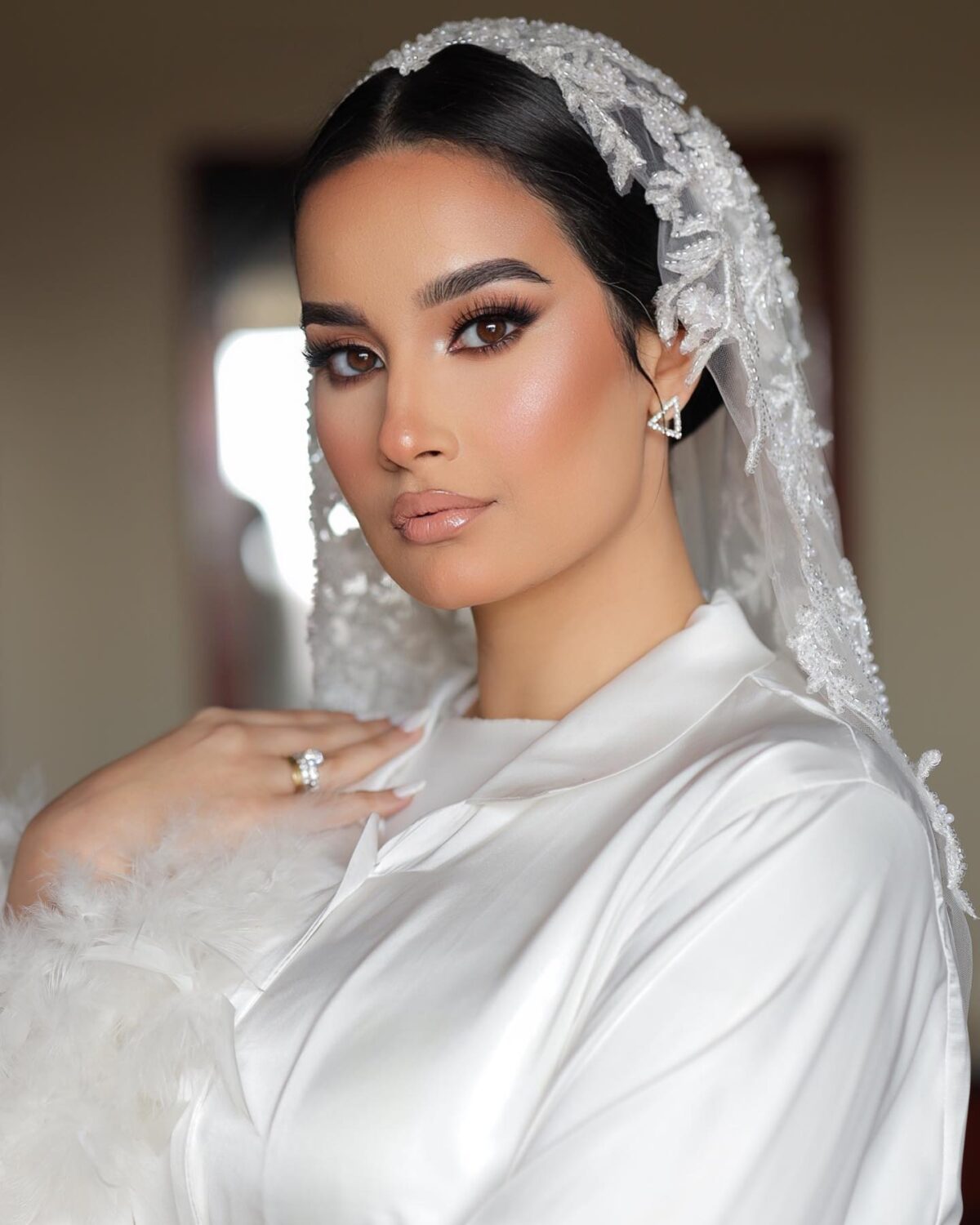 أما لو العروسة حابة لوك جريء شوية، آية بتعرف توازن بين الألوان القوية والنعومة. ممكن تعمل سموكي ناعم بدرجات رمادية أو نحاسية وتختار لون شفايف قوي زي الأحمر أو الفوشيا، لكن دايمًا بتحافظ إن الإطلالة تفضل أنيقة ومتناسقة. عندها حس فني عالي جدًا في توزيع الكونتور والهايلايتر بطريقة تبرز الملامح بخفة وبدون خطوط أو مبالغة.