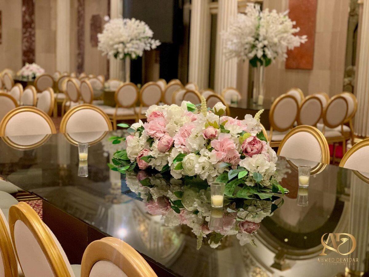 في شغل الديكور، Ahmed Dewidar بيحب الأسلوب الأنيق البسيط. الكوشة بتتصمم على حجم القاعة بحيث تبقى متوازنة في الصور، الطاولات بيتحط عليها مركز أنيق من غير زحمة، وركن التصوير بيتعمل على نفس الثيم علشان الألبوم يطلع متناغم. الإضاءة كمان عنده عنصر محوري، بيتعامل معاها كأنها جزء من الديكور، بتتوزع صح عشان تدي عمق وراحة للعين من غير مبالغة.