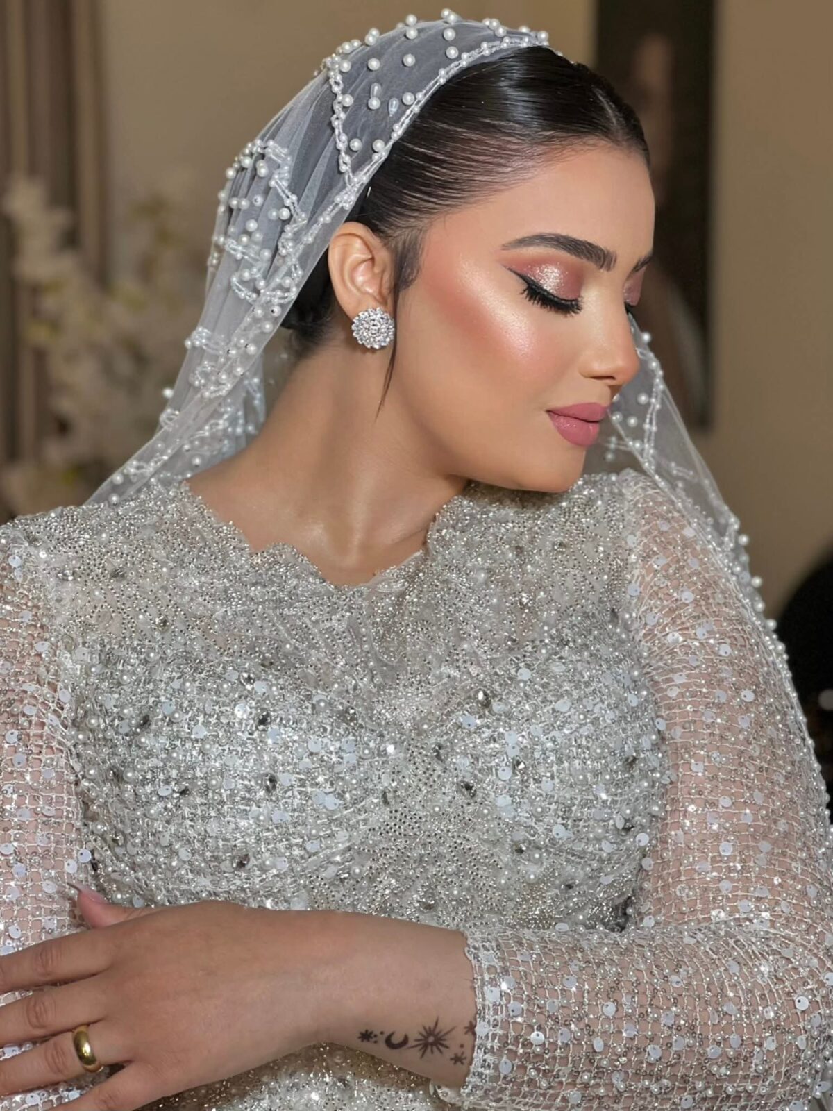 كمان هي مش بتبدأ المكياج على طول، لكن بتحضر البشرة الأول باستخدام مرطبات وخطوات بسيطة تجهز الجلد علشان الفاونديشن يثبت كويس ومايبقاش فيه تكتل أو لمعان زايد. الخطوة دي بتفرق جدًا في الشكل النهائي وبتدي نعومة للمكياج.