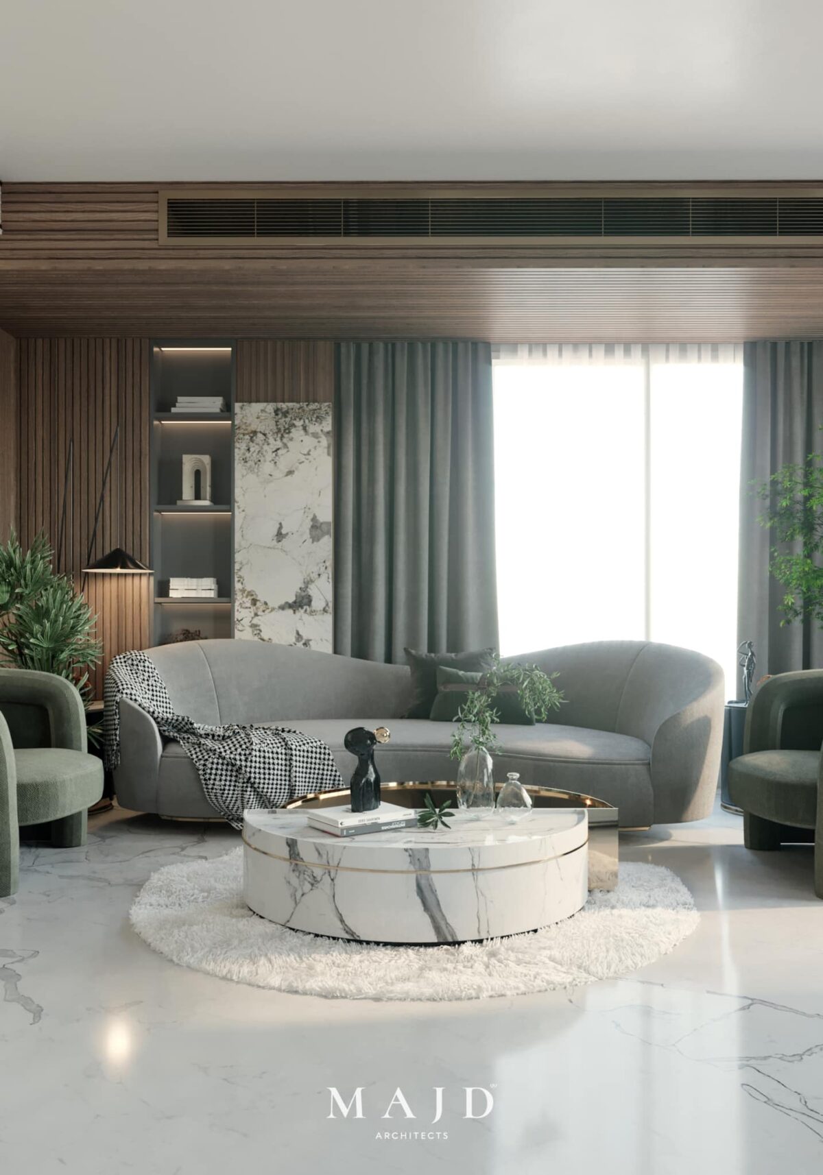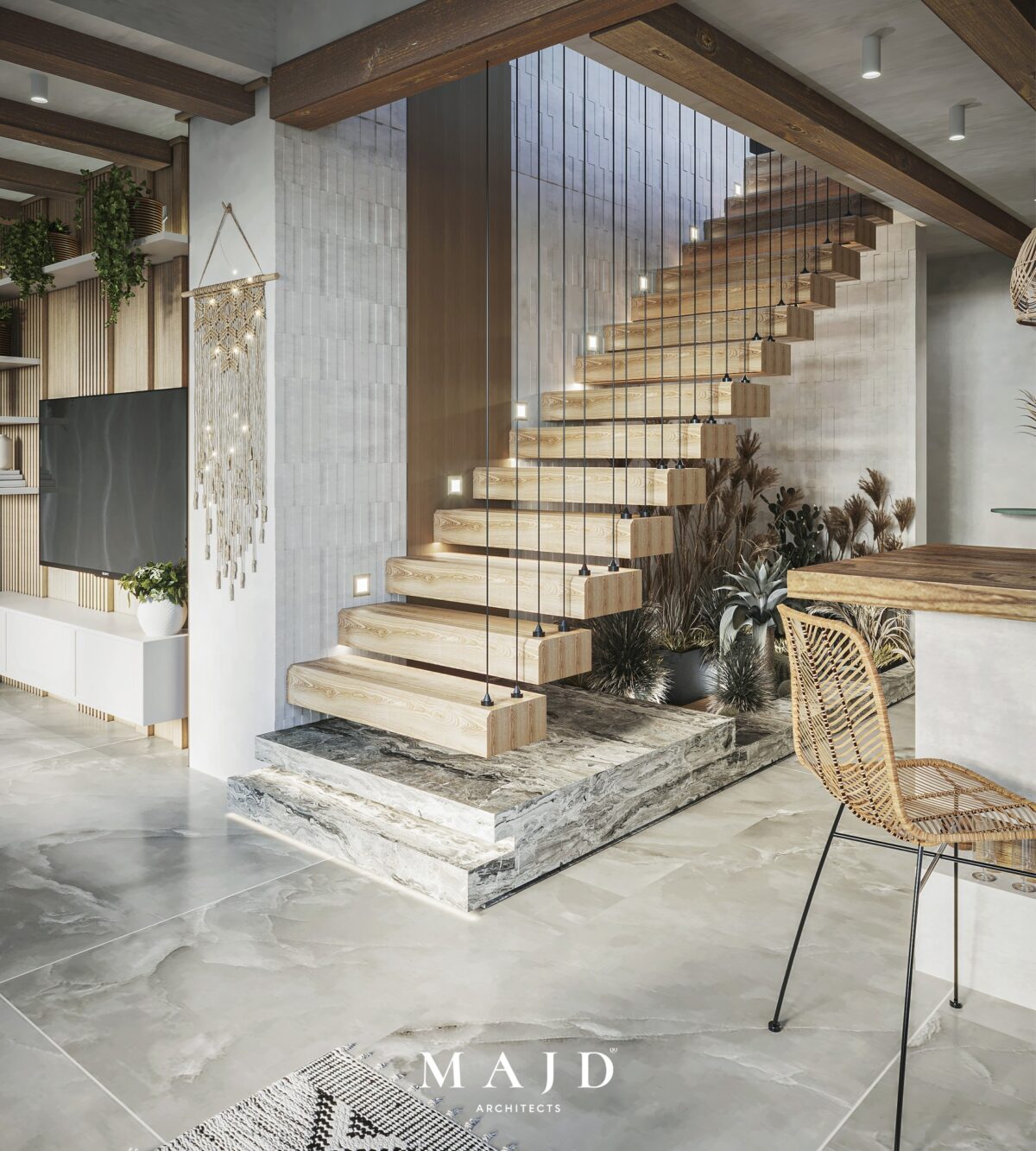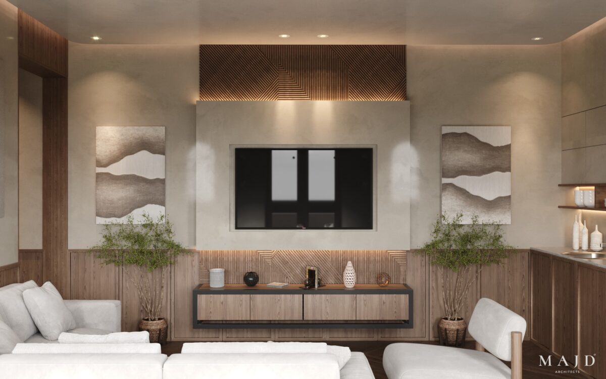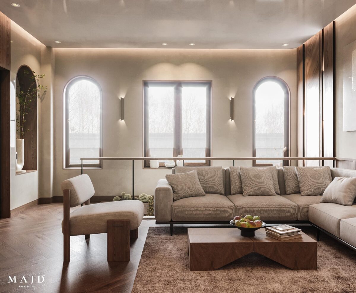 MAJD Architects بتركّز على اختيار خامات عملية تتحمّل الاستخدام اليومي وتكون مناسبة لطبيعة البيت، علشان المكان يفضل مريح ومستقر على المدى الطويل. الراحة هنا مش بس في الشكل، لكن في إن البيت يفضل عملي وسهل التعامل معاه في العيشة اليومية.
