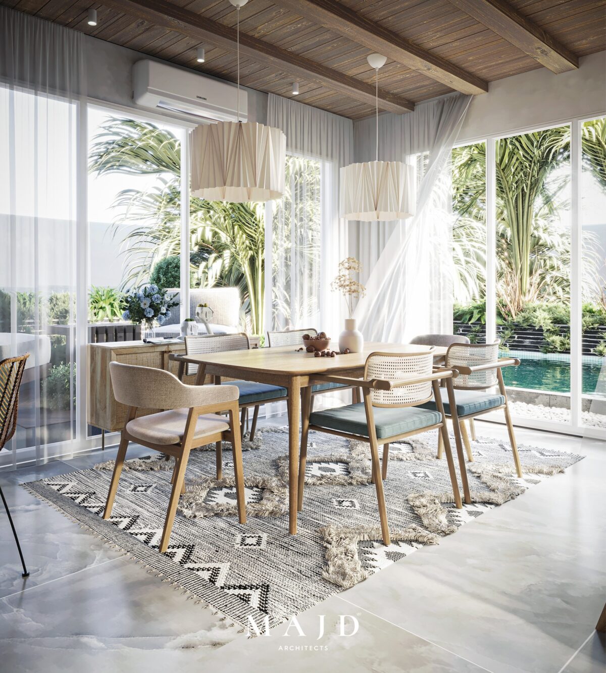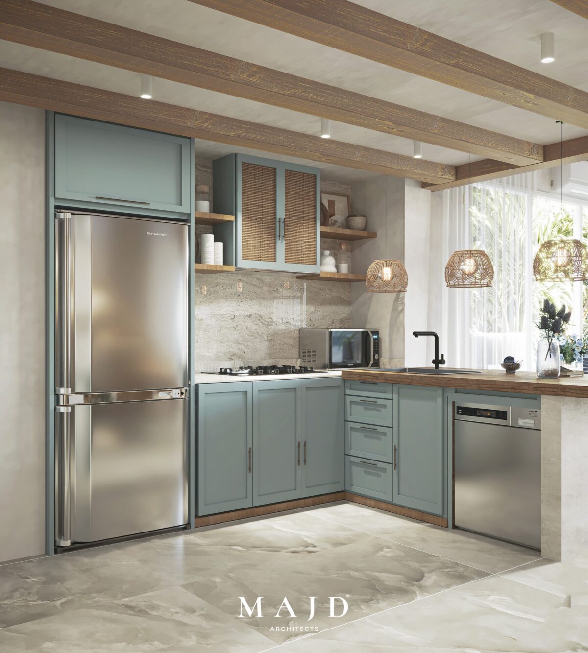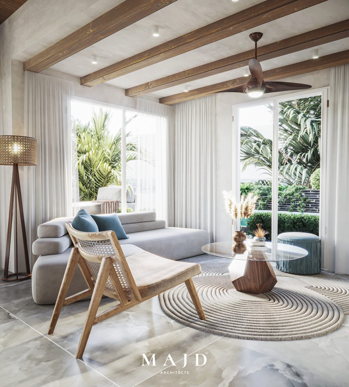 MAJD Architects بتركّز على اختيار خامات عملية تتحمّل الاستخدام اليومي وتكون مناسبة لطبيعة البيت، علشان المكان يفضل مريح ومستقر على المدى الطويل. الراحة هنا مش بس في الشكل، لكن في إن البيت يفضل عملي وسهل التعامل معاه في العيشة اليومية.
