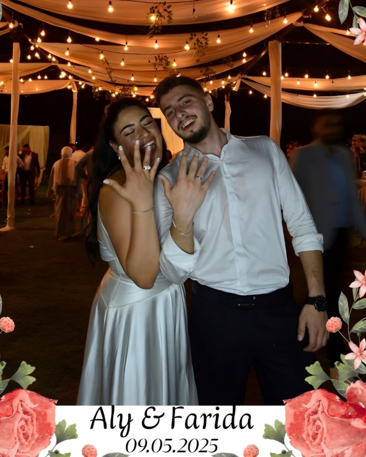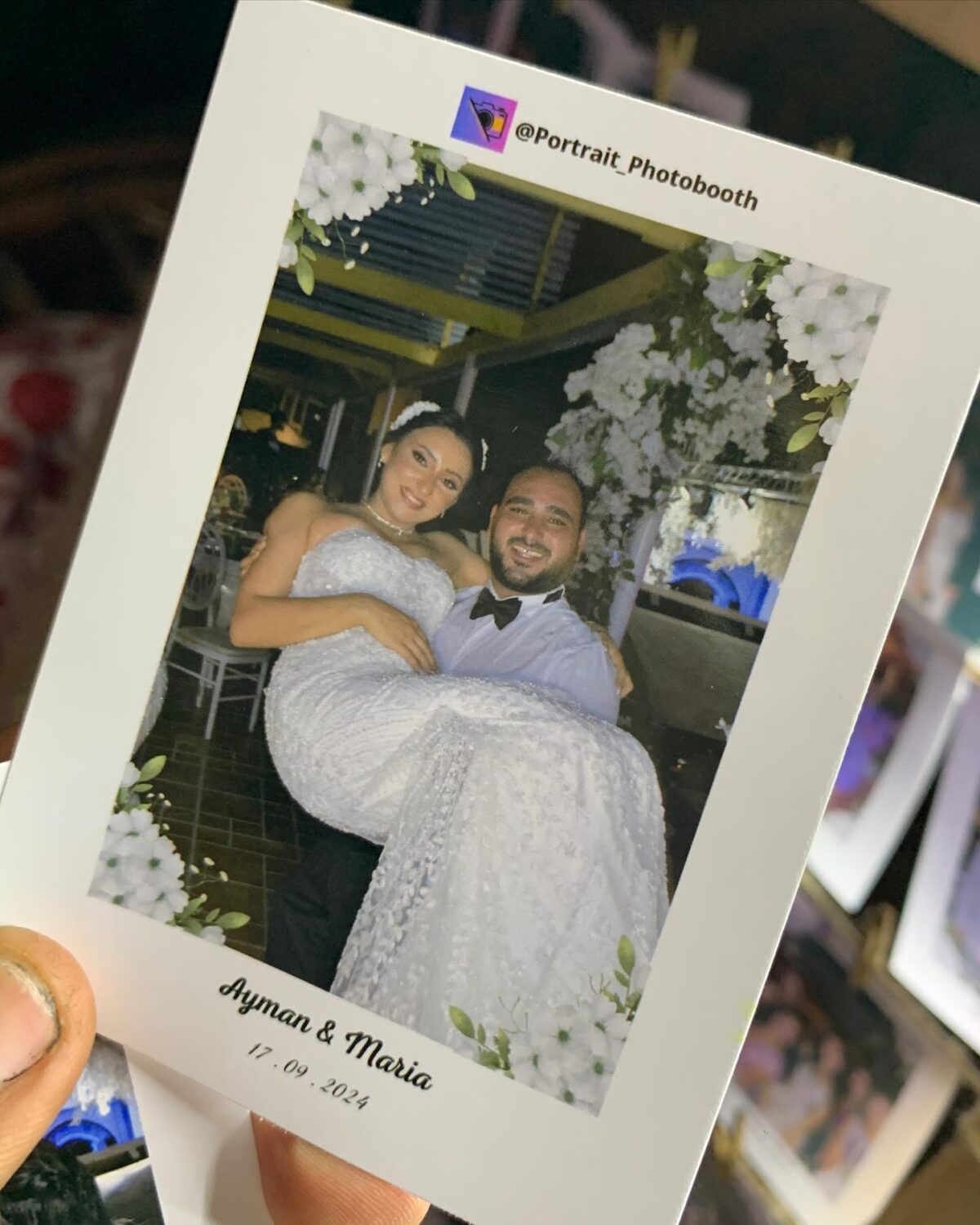 Portrait Photobooth كمان بتوفر إطارات قابلة للتخصيص بالكامل بأسماء العروسين، تاريخ الفرح أو شعار بسيط خاص بالمناسبة. وده بيحوّل كل صورة لهدية شخصية لكل ضيف.
