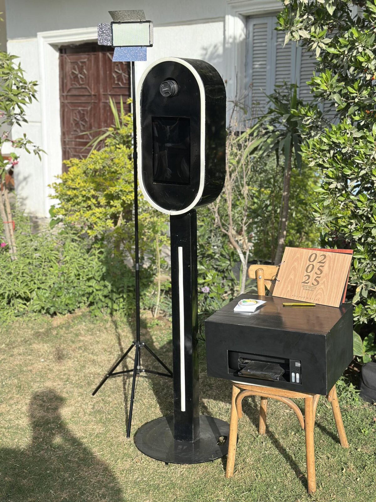 جهاز Classy Photobooth معمول بتصميم أنيق وراقي يناسب أي ديكور سواء قاعة فخمة أو حفلة بسيطة في البيت. الكاميرا بدقة عالية ومعاها إضاءة LED متوازنة بتخلي الصور تطلع بألوان طبيعية وجودة ممتازة. الضيوف يقدروا يختاروا من شاشة التاتش الفلتر أو الإطار اللي يعجبهم، وفي ثواني الصورة بتتطبع على ورق فوتوغرافي متين يعيش معاهم كتذكار شيك.