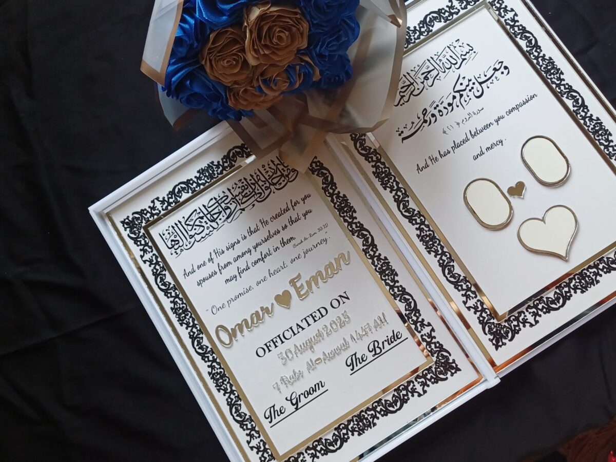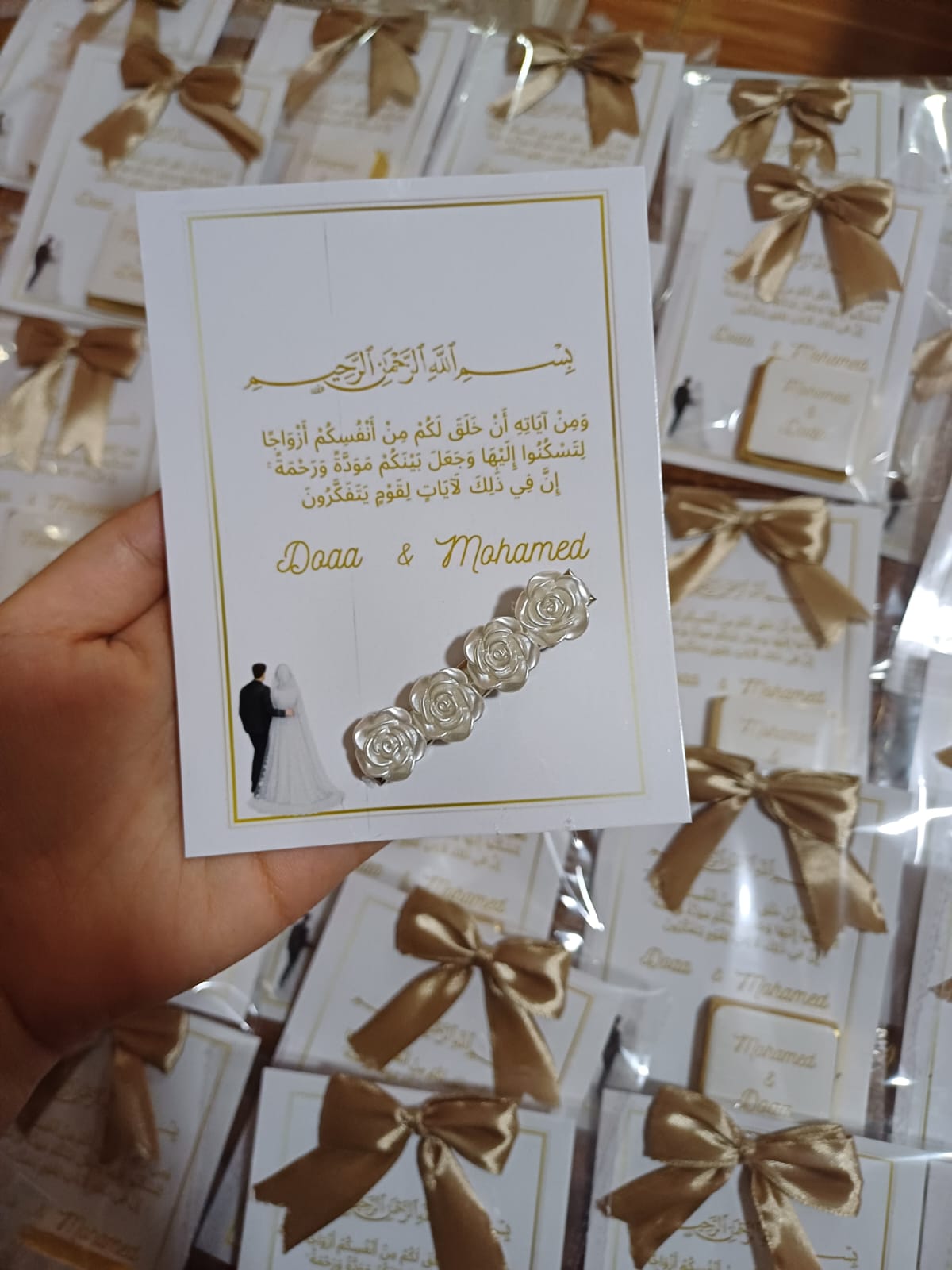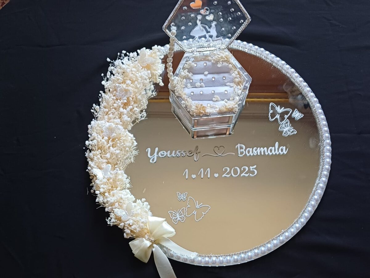 غير المنديل والبصمة وصينية الشبكة Hanen gallery كمان بتوفر تشكيلة واسعة من اكسسوارات الفرح التانية زي حامل الدبلة المصنوع من زجاج شفاف او كريستال صغير يدي رقة للترابيزه وطقم خاتم مودرن بيشتغل على اي ديكور سواء كان كلاسيكي او عصري وكمان لوحات تذكارية صغيرة مطبوعة بالوان مائية تحمل صور ضحكات الضيوف وكلماتهم الرقيقة وفوانيس رومانسية بتشتغل بالبطاريه تضيف اضاءة خافتة ساحرة وحوامل ورد بتصاميم متداخلة بين المعدن المشغول يدويا او الكريستال اللي يلمع تحت اضواء المكان لو عايزين تنقلوا تجربة الكتب لاجواء اكتر دفء وبصمة فنية