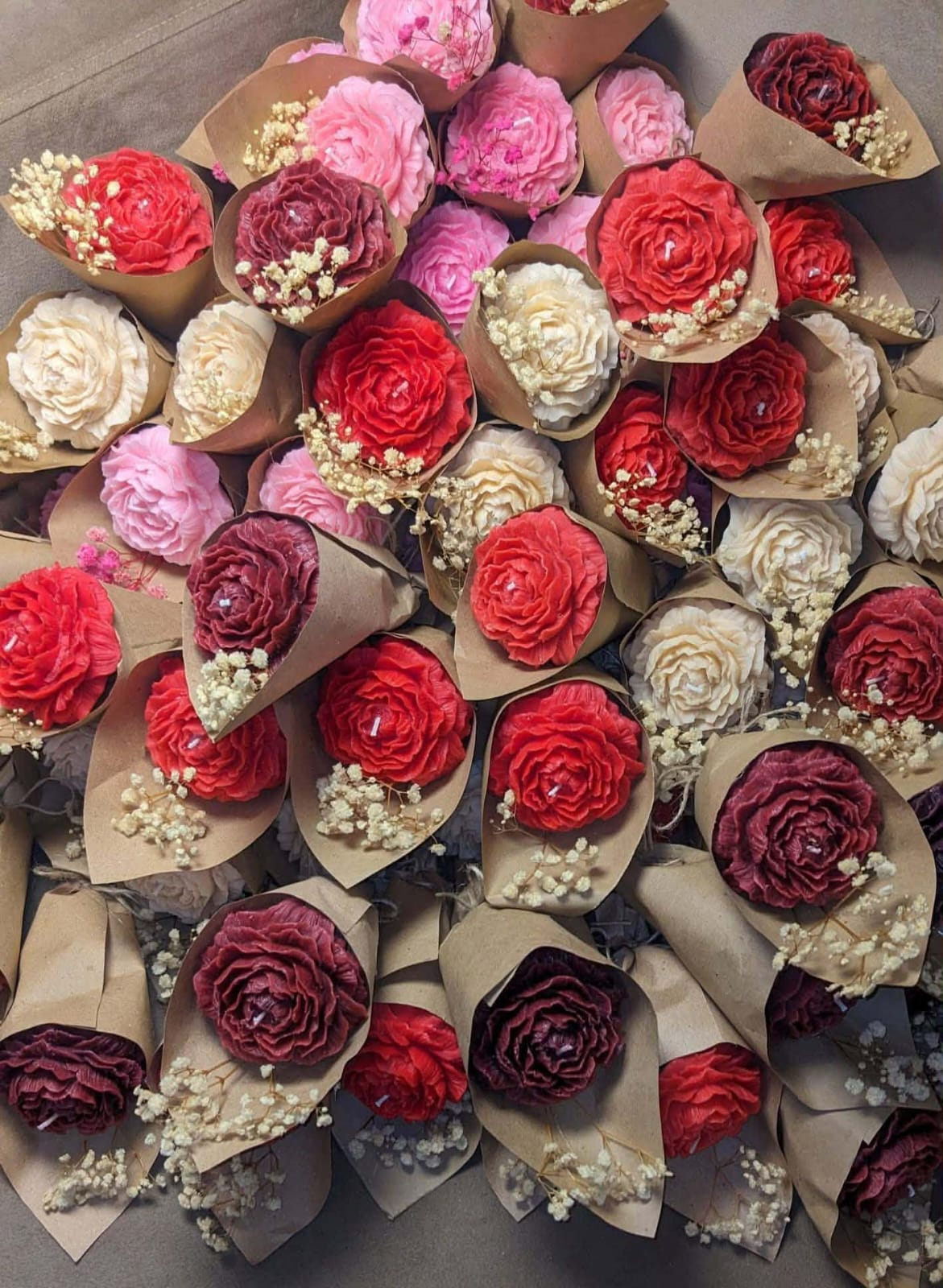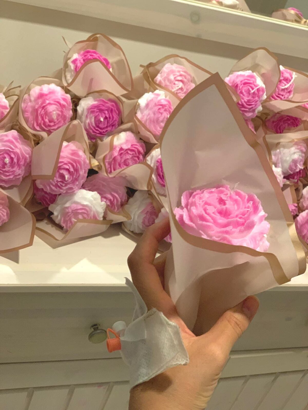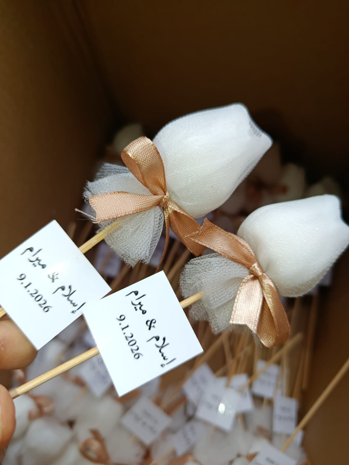 كمان عندهم توزيعات بوكيه ورد جوري، اللي بتجمع بين شكل الورد الطبيعي والرقي في التغليف. الورود بتتغلف في بوكيهات صغيرة، ممكن تتربط بشريطة ستان أو تتحط في علبة شفافة تضيف لمسة رومانسية لكل طاولة. دي من الأفكار اللي بتدي شكل جذاب ومبهج للفرح وتخلي كل ضيف ياخد معاه قطعة من اليوم الكبير.