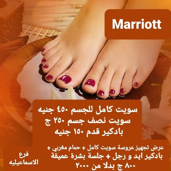 الحمام المغربي في ماريوت سبا من أكتر الحاجات اللي المكان مشهور بيها، بيتعمل بطريقة احترافية جدًا باستخدام منتجات طبيعية زي الطمي المغربي والصابون البلدي واللوفة الأصلية. الجلسة دي بتنضف الجسم بعمق، وبتشيل أي خلايا ميتة، وبتسيب البشرة ناعمة ومترطبة ولونها موحد. بعد الجلسة بتحسي فعلًا إنك اتجددتي وإن جسمك بقى ناعم وريحته حلوة، وده بيكون مثالي قبل يوم الفرح.