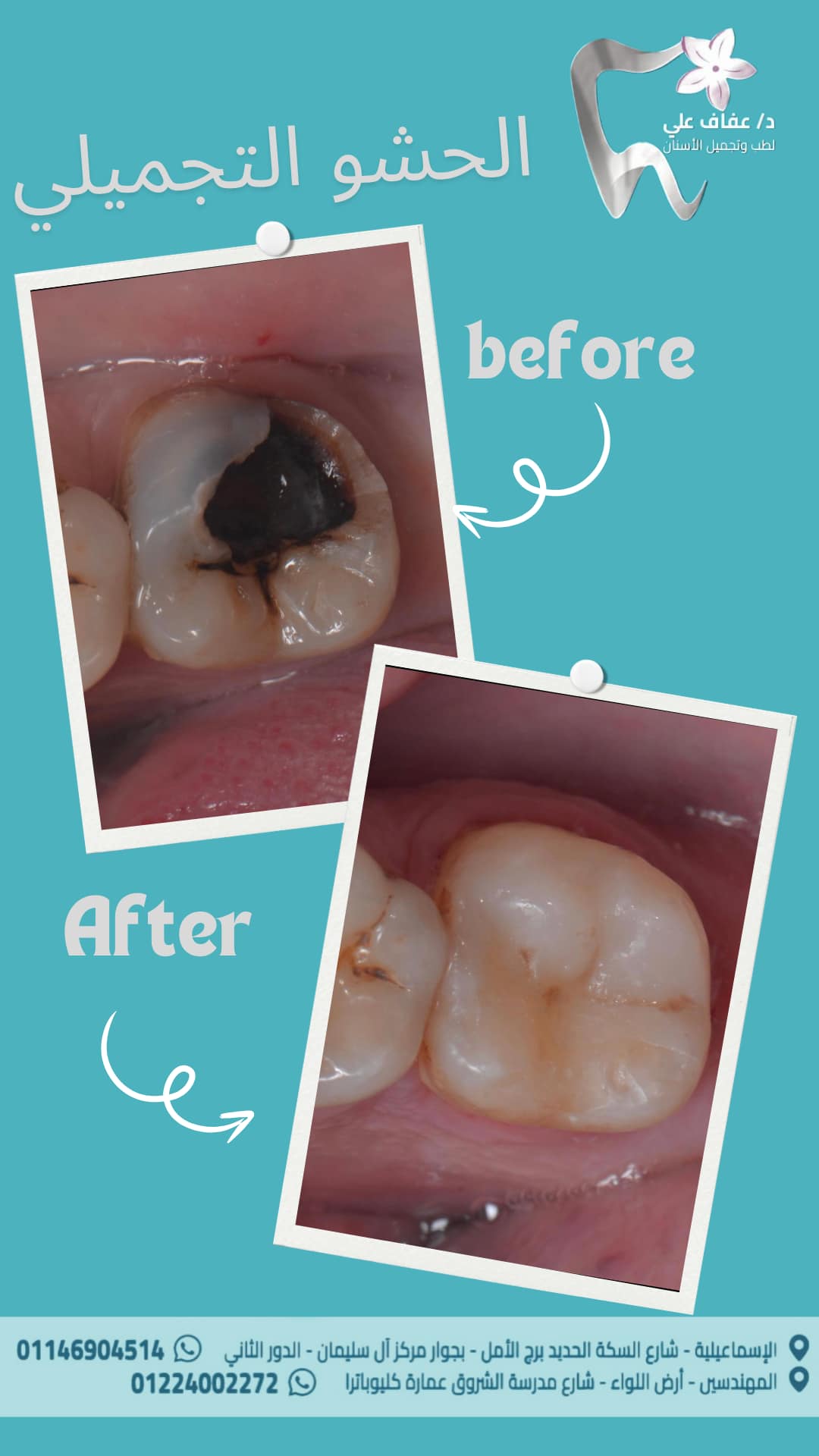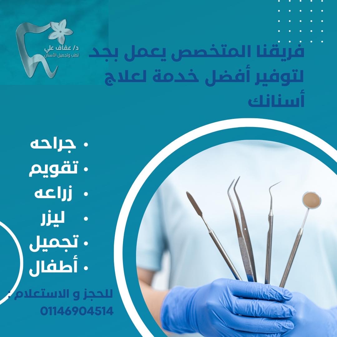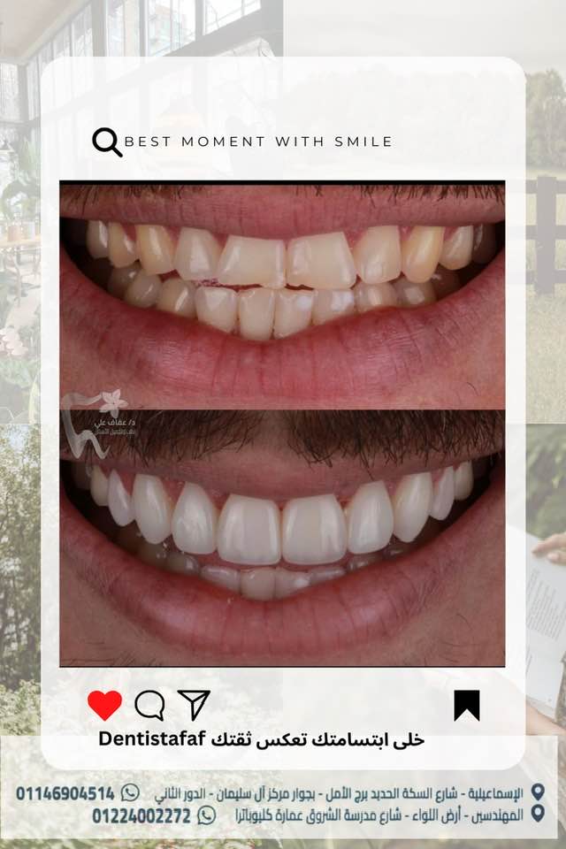 دكتورة عفاف علي عبد الرازق بتجمع بين الخبرة والدقة والاهتمام براحة المريض، وده بيخلي العيادة اختيار مناسب لأي حد عايز يحافظ على صحة أسنانه أو يحسّن شكل ابتسامته قبل أي مناسبة مهمة. النتيجة في النهاية بتكون ابتسامة صحية وطبيعية تدي إحساس بالثقة وتفضل مع صاحبها سنين طويلة.