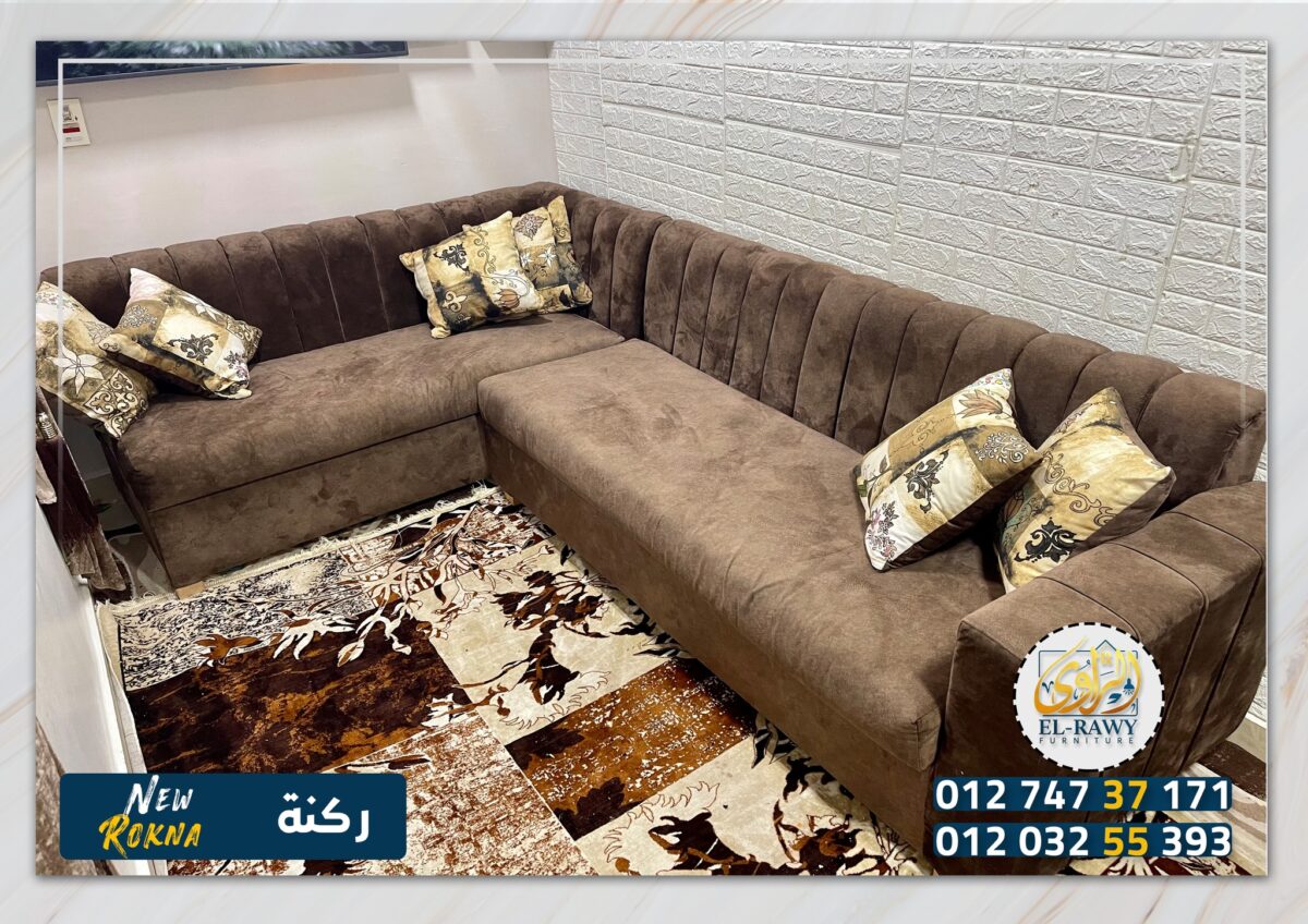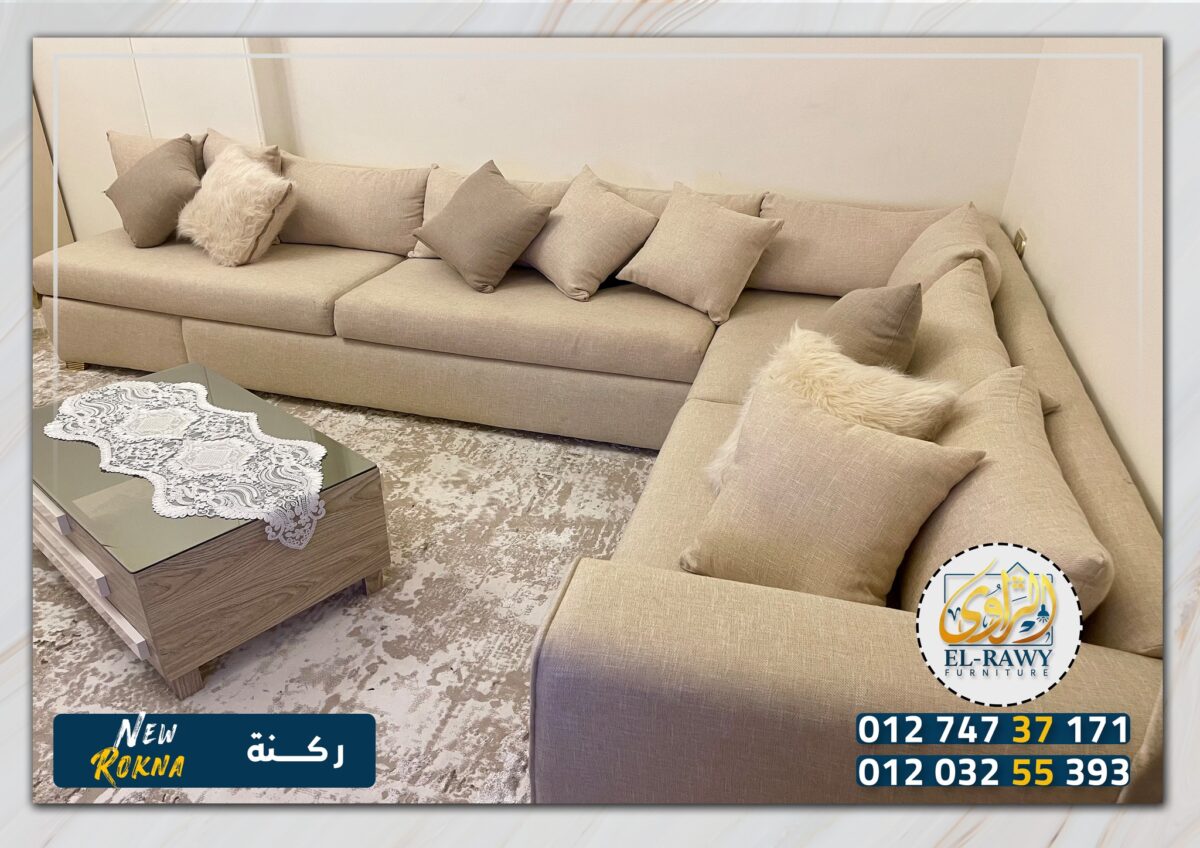 – الركنات “L” عند Elrawy Modular ومتعددة الاستخدام، تقدر تبدأ بقطعة واحدة وتزوّد عليها مع الوقت. التنجيد قماش كتان عملي وسهل التنضيف أو مخمل ناعم للناس اللي بتحب الفخامة.