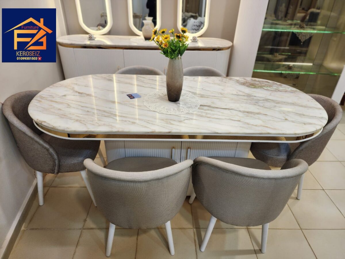 – طاولة قابلة للتمديد من ٤ لـ٨ كراسي بآلية Pull-Out سلسة؛ السطح رخام صناعي أو خشب معالج ضد الخدش والسوائل.