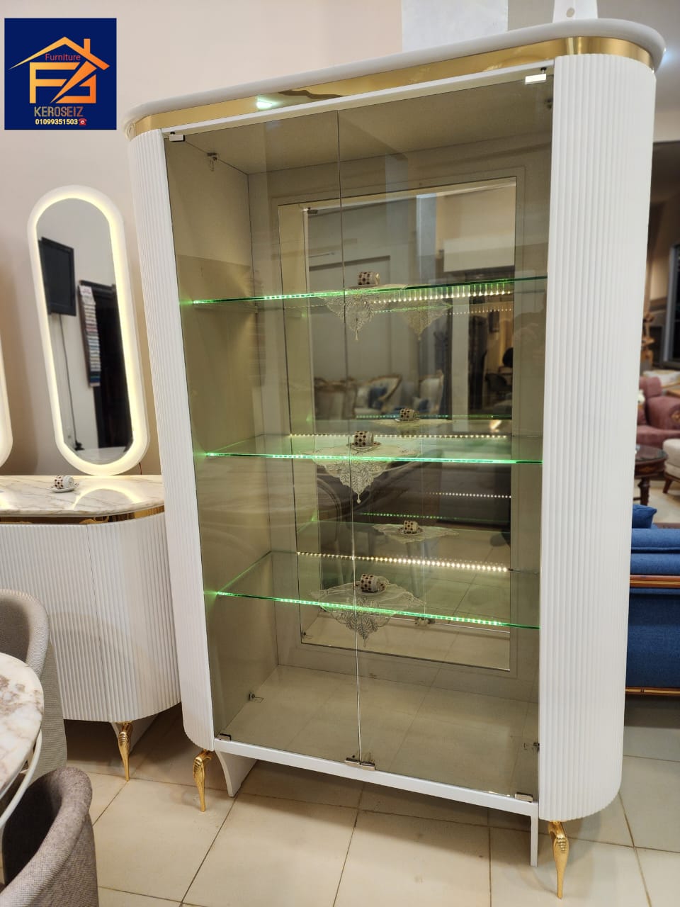 – بوفيه ونيش بواجهات Push-to-Open وأرفف داخلية خشب وزجاج لعرض الصحون والديكورات.