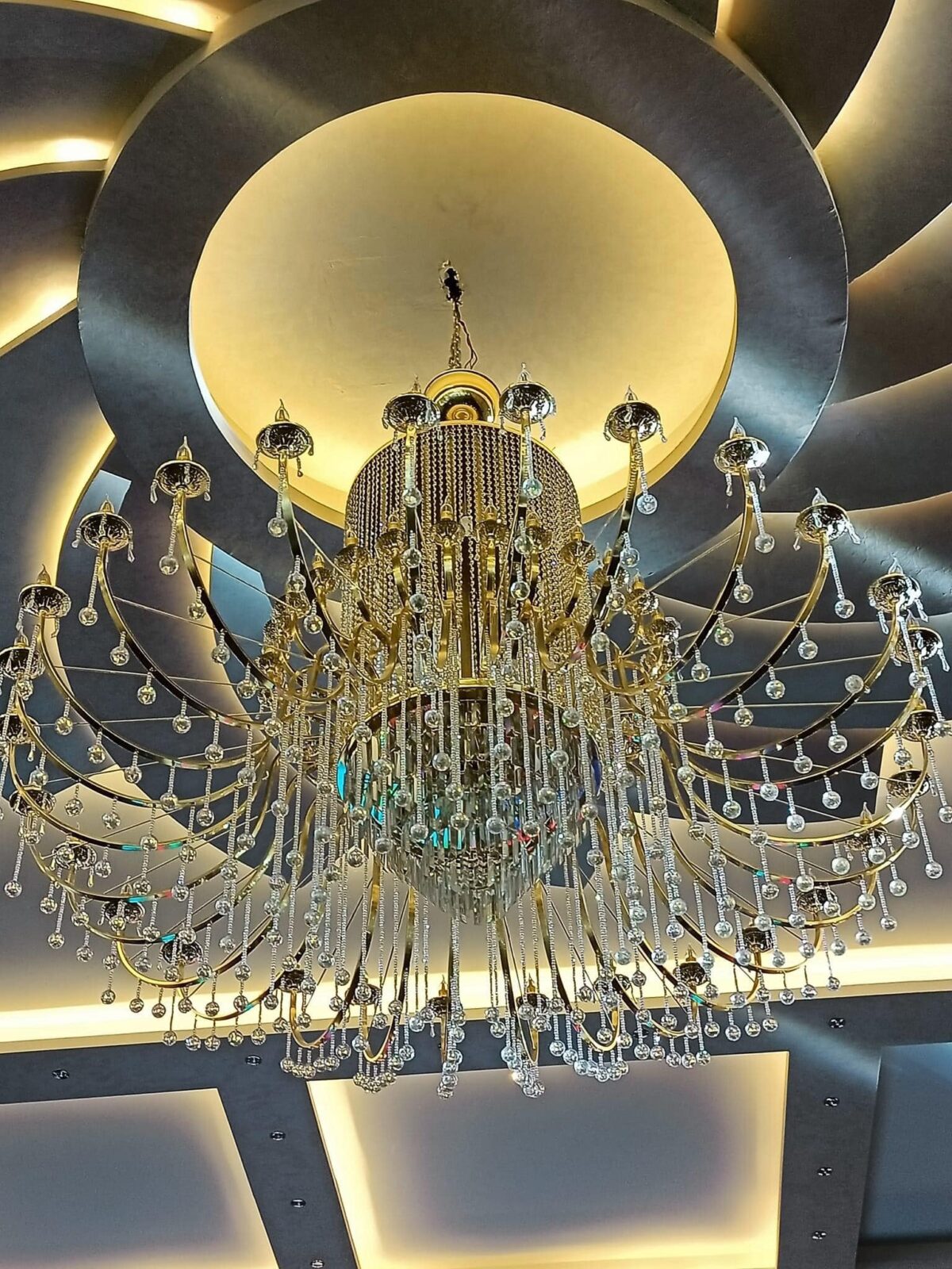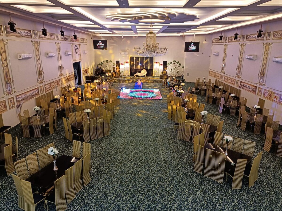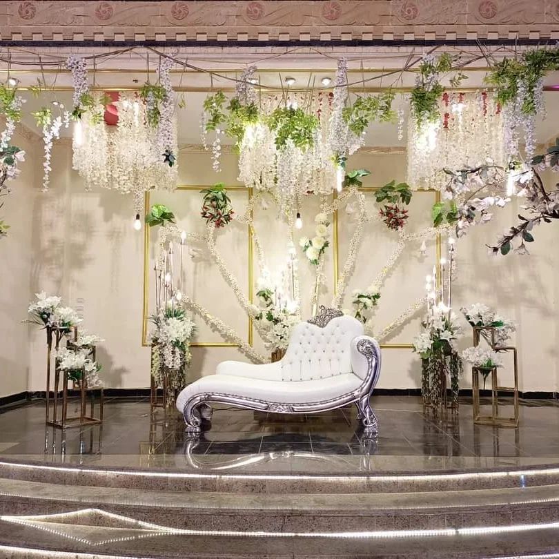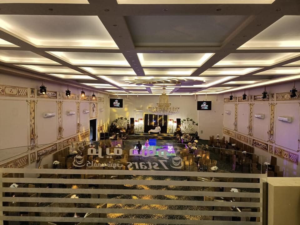 القاعة مزينة بديكورات فاخرة تجمع بين الطابع العصري والكلاسيكي، مع ثريات كبيرة وإضاءة حديثة قابلة للتعديل لتتناسب مع فقرات الحفل. الألوان الهادية والخامات المميزة بتدي إحساس بالفخامة والراحة في نفس الوقت.
