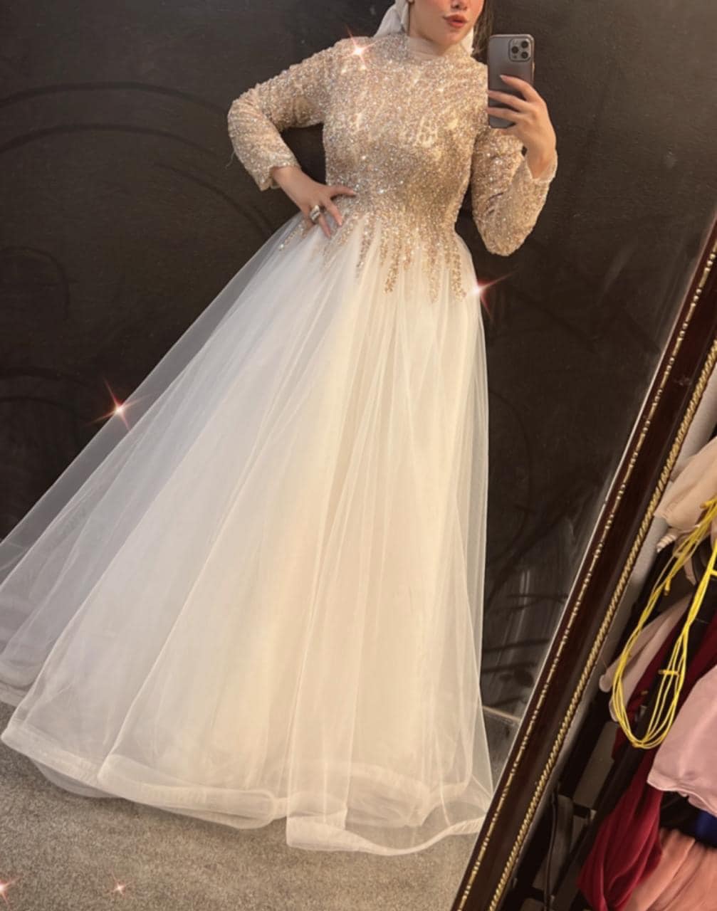ولأن اللوك الكامل بيفرق، الأتيليه عنده تشكيلة طرَح والتيجان والأحزمة اللي بتكمل الفستان. الطرح ممكن تبقى طويلة بستايل كلاسيكي أو قصيرة لو حد بتحب الحرية في الحركة، والتاج بيكون بسيط أو مزين بالكريستال على حسب روح التصميم. الأحزمة بتحدد الخصر وبتضيف لمسة بسيطة على شكل الفستان من غير ما تغطي عليه.