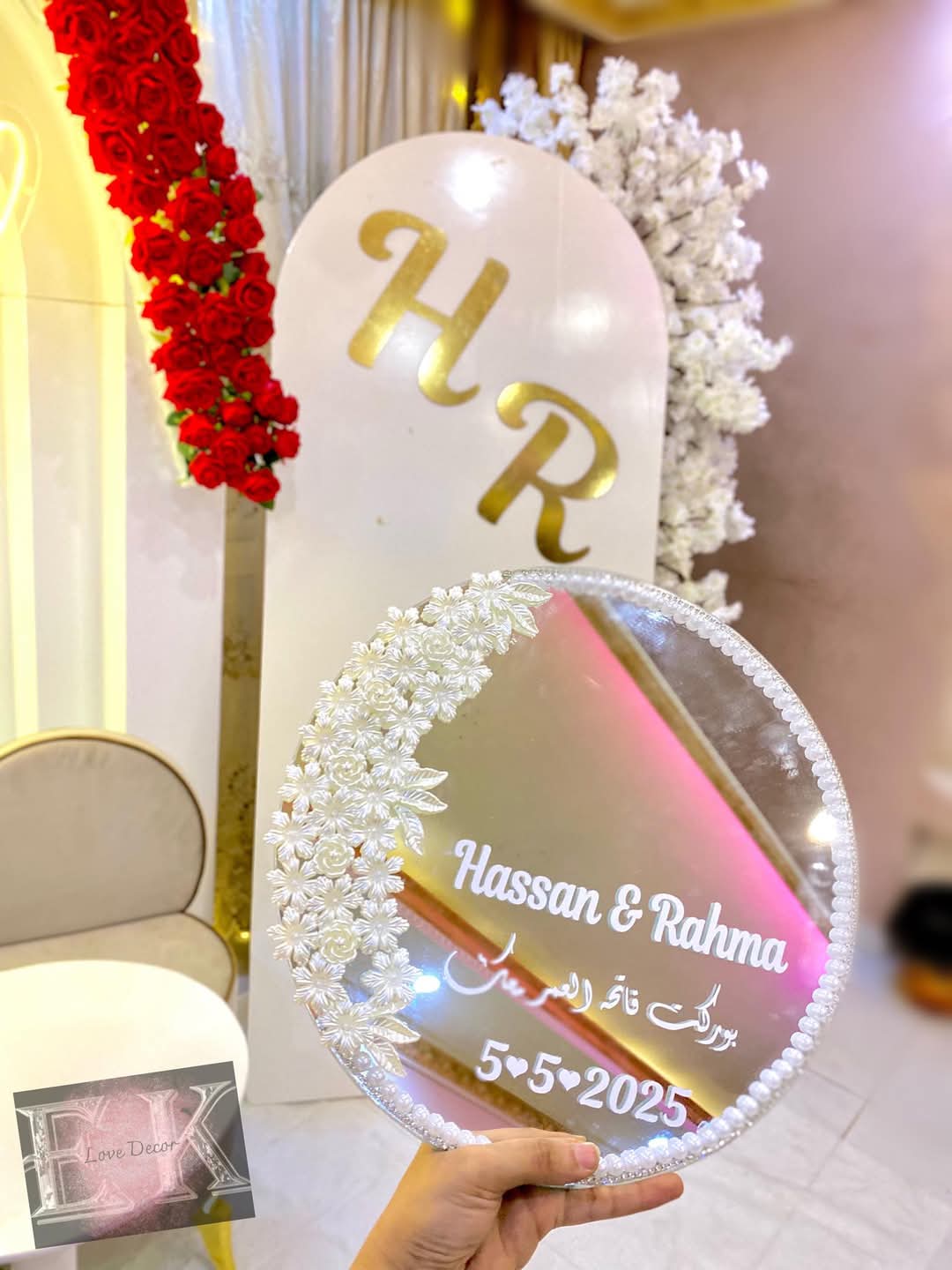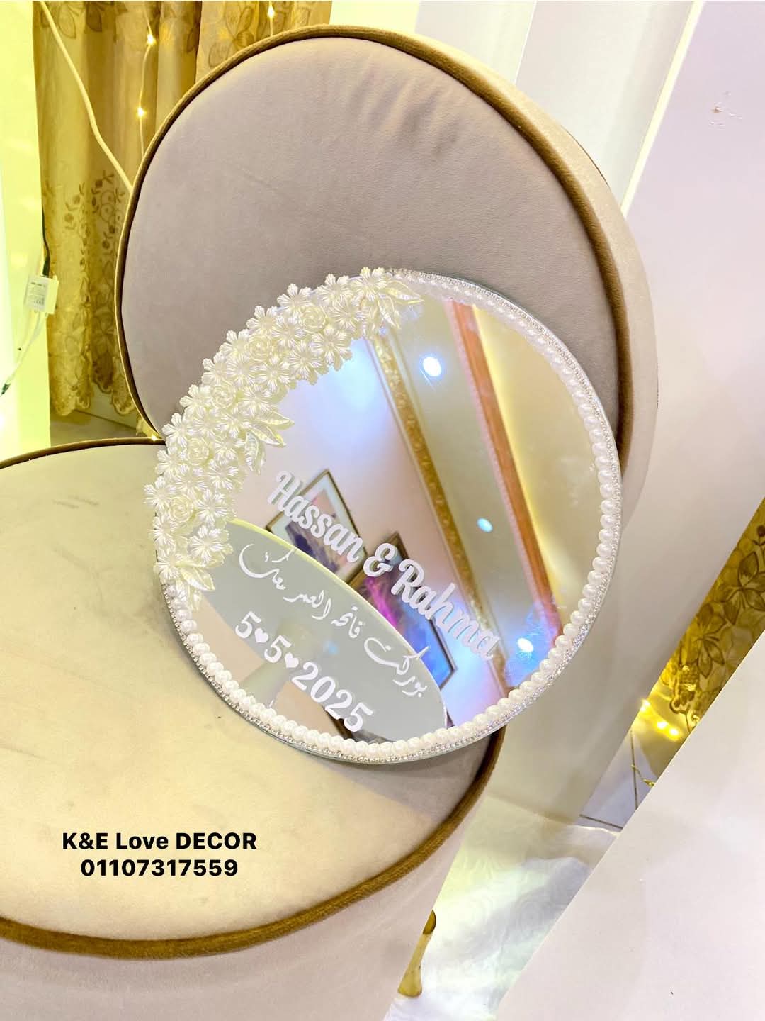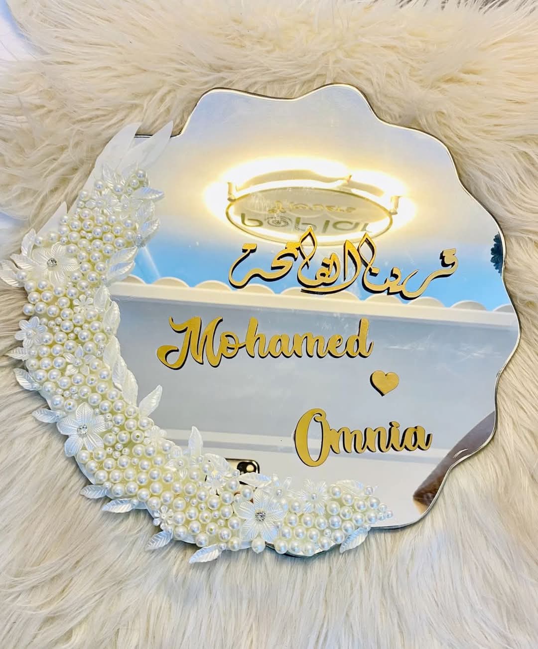- مرايات كتب الكتاب محفورة بالأسماء والتاريخ بخط أنيق.