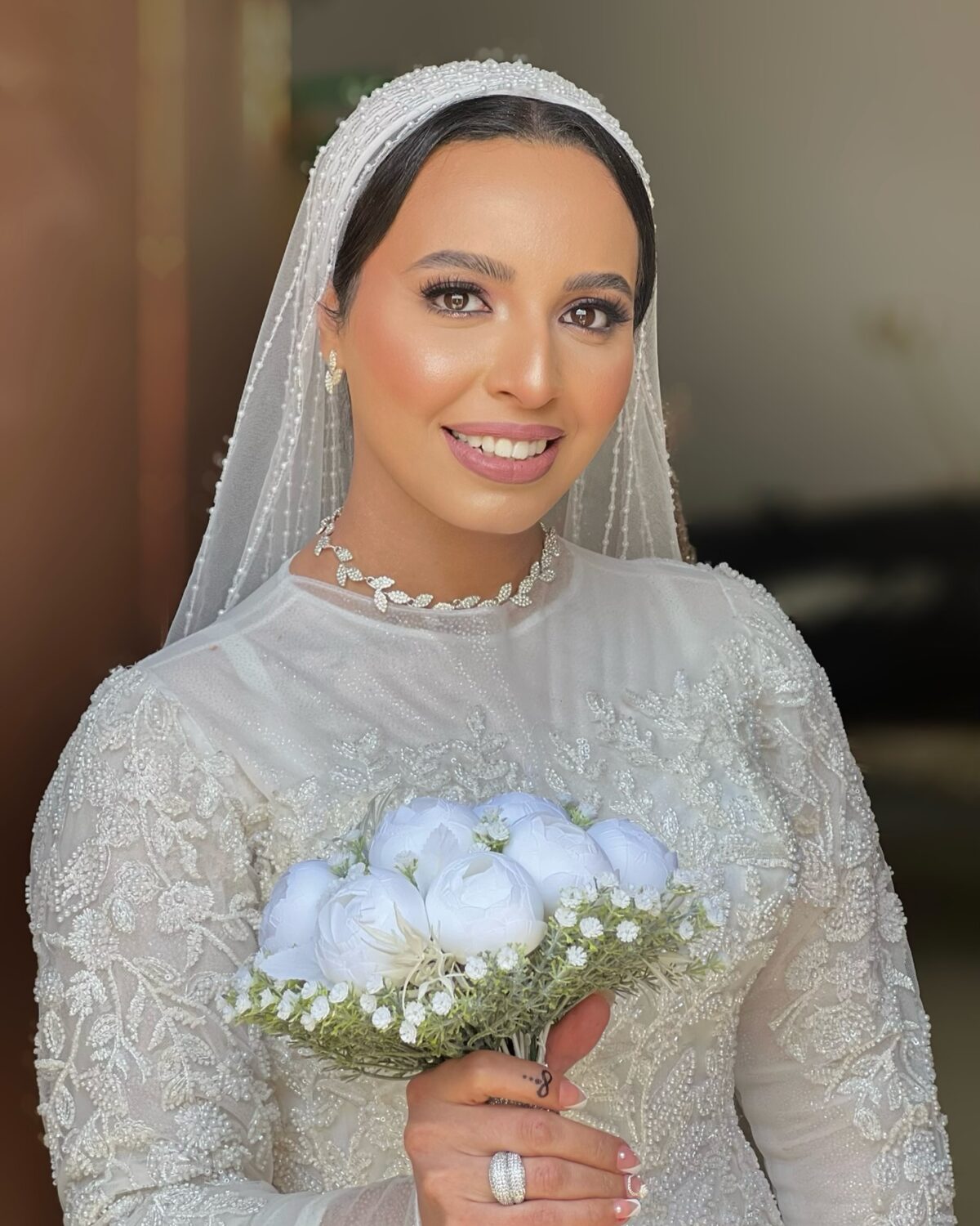في الفاونديشن، داليا كامل بتفضّل الدرجات الطبيعية اللي قريبة من لون البشرة الحقيقي. بتحب اللوك الخفيف اللي يبان طبيعي من غير ما يخفي تفاصيل الوش. طريقة دمجها للفاونديشن بتكون هادية ومظبوطة لحد ما الوش يبقى موحد ومريح للعين سواء في الصورة أو على الطبيعة. الأسلوب ده بيدي للعروسة شكل ناعم وأنيق.