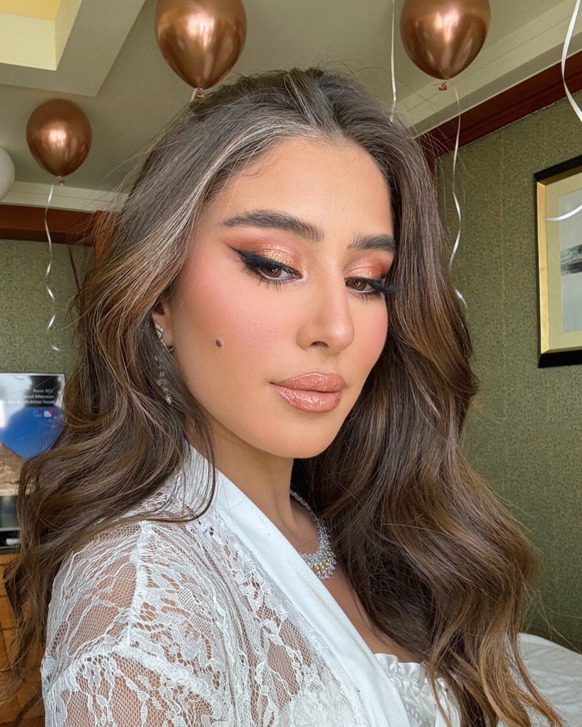 ميكب العيون من أقوى نقط تميز دينا راغب. بتعرف تختار درجات الشادو اللي تمشي مع كل عين، سواء الترابي الهادي أو درجات أغمق بسيطة تدي عمق وجاذبية. بتركّز على فتح العين وإبراز جمالها بدون ما يكون اللوك تقيل. وكمان بتميل لاختيار رموش خفيفة أو فردية عشان اللوك يفضل طبيعي ومتناسق.