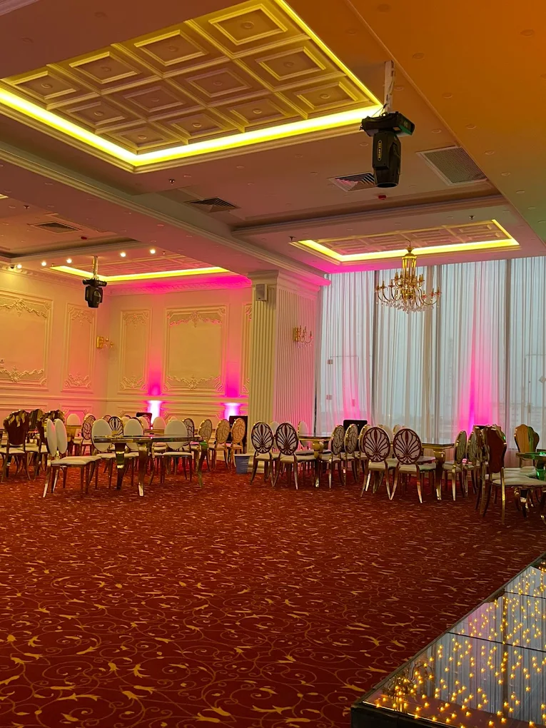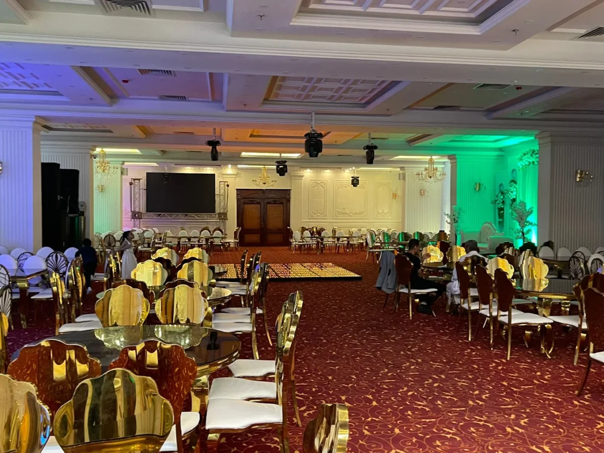 القاعة متوسطة المساحة، ودي ميزة كويسة للناس اللي بتعمل حفلة بعدد ضيوف معقول، سواء أهل وأصحاب أو مناسبة صغيرة بحضور محدود. التصميم بسيط ومرتب، فيه مكان مخصص للكوشة، وترابيزات موزعة بشكل يسمح بالحركة، ومكان مخصص للبوفيه أو تقديم الضيافة.