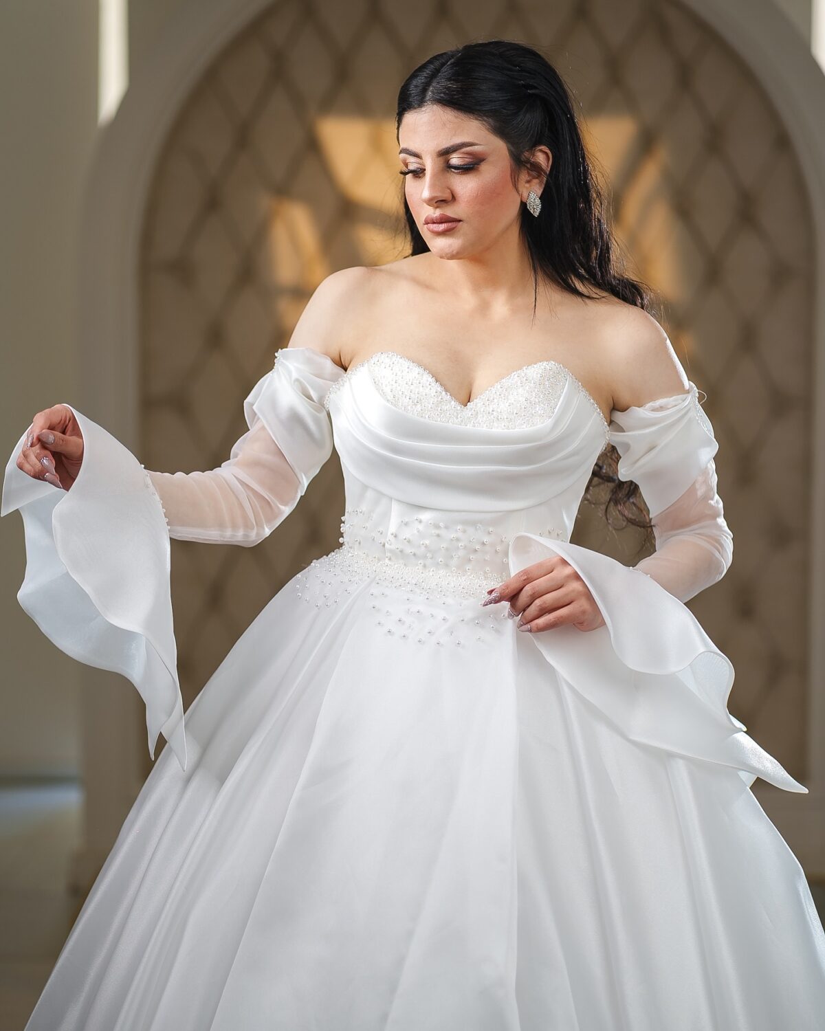 الموديلات هناك متنوعة جدًا، تلاقي الفساتين المنفوشة اللي فيها لمسة ملكية، وتلاقي كمان الفساتين الستان الناعمة أو القصات الميرميد اللي بتمشي على الجسم وبتبرز جماله. فيه موديلات بالكم، وأخرى كتف واحد، واللي فيها شغل يدوي على التول أو الدانتيل، وكل واحدة ليها ستايل يميزها. ده غير إن التصميمات اللي بيعرضوها دايمًا مواكبة للموضة ومختارة بذوق، علشان كل عروسة تحس إنها عايشة اللحظة بطريقتها.