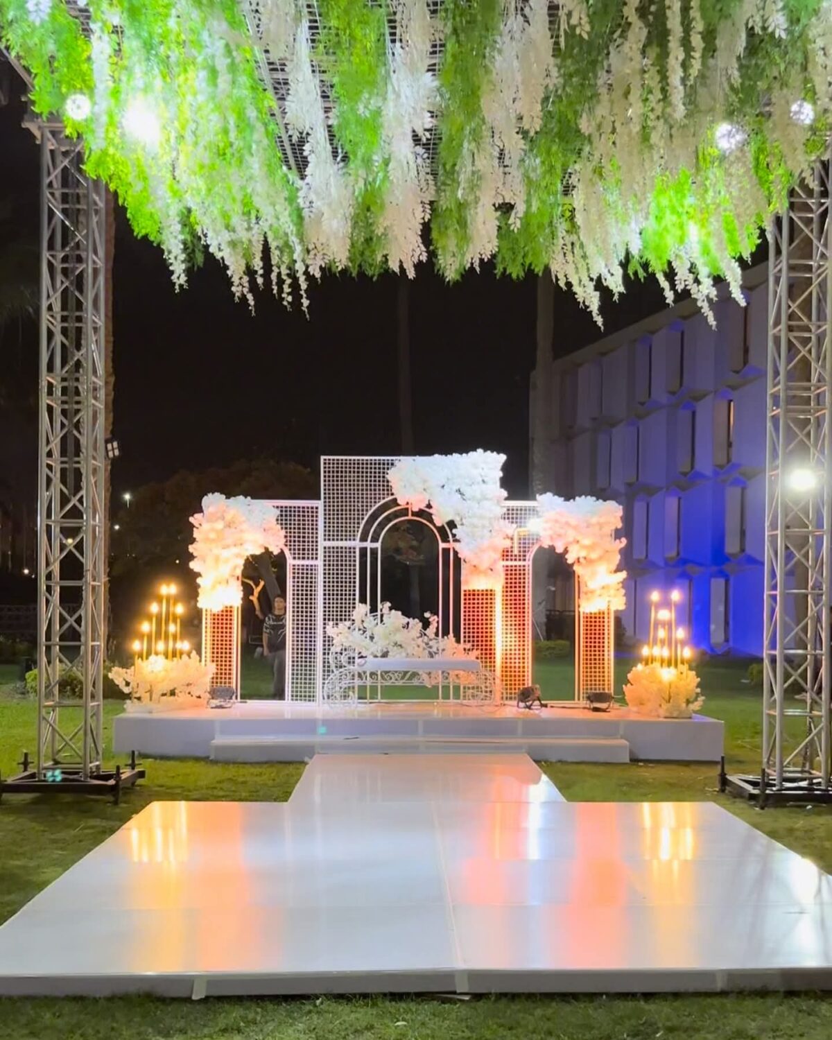 الإضاءة عندها عنصر أساسي في نجاح الفرح. بتوزعها بطريقة تبرز جمال الديكور وتضيف جو رومانسي وراقي للمكان. الإضاءة عندها مش مجرد إضاءة، لكنها جزء من التصميم الفني اللي بيخلي كل لحظة شكلها مميز، سواء في الزفة أو الرقصة الأولى أو فقرة الصور.