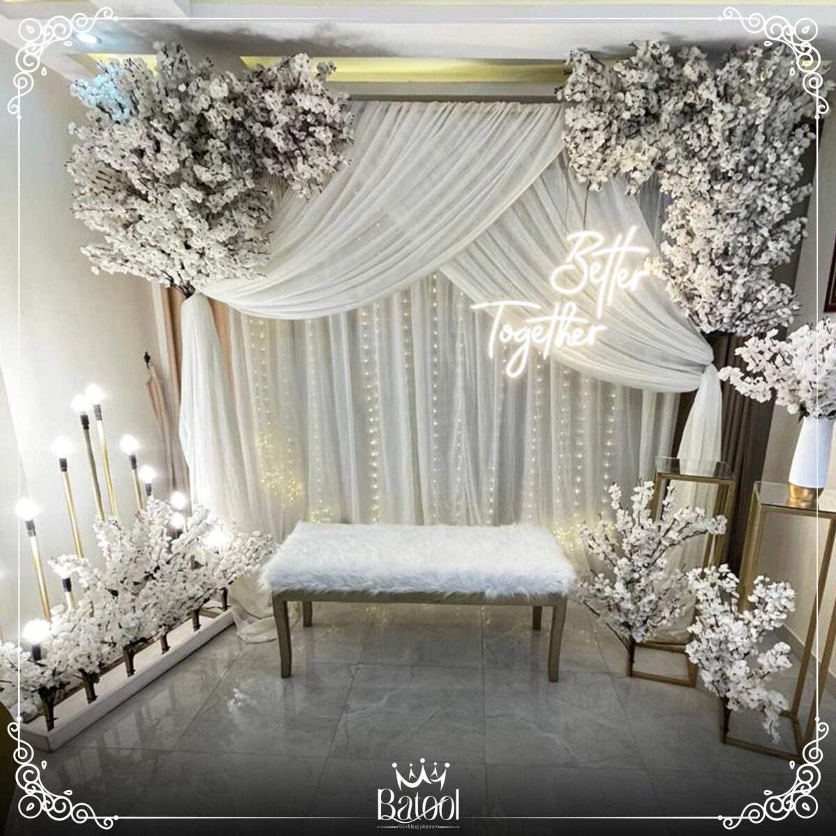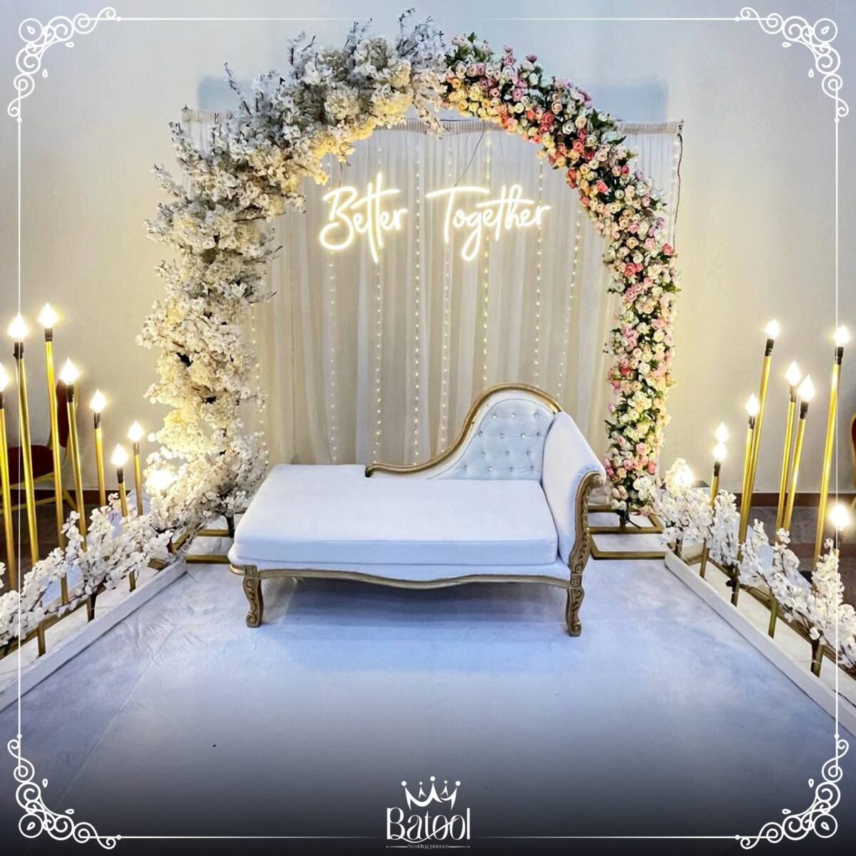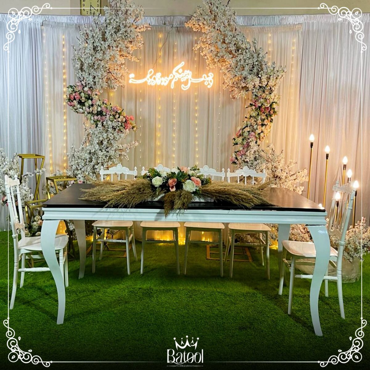 من ناحية الميزانية، Batool بتقدر توازن بين الأناقة والتكلفة. بتعرف تستخدم الخامات البسيطة بطريقة شيك وتقدم بدائل ذكية زي ورود موسمية أو توزيع إضاءة قوية تغني عن ديكورات مكلفة. هدفها دايمًا إن الشكل النهائي يطلع راقي ومناسب لإمكانيات العروسين.