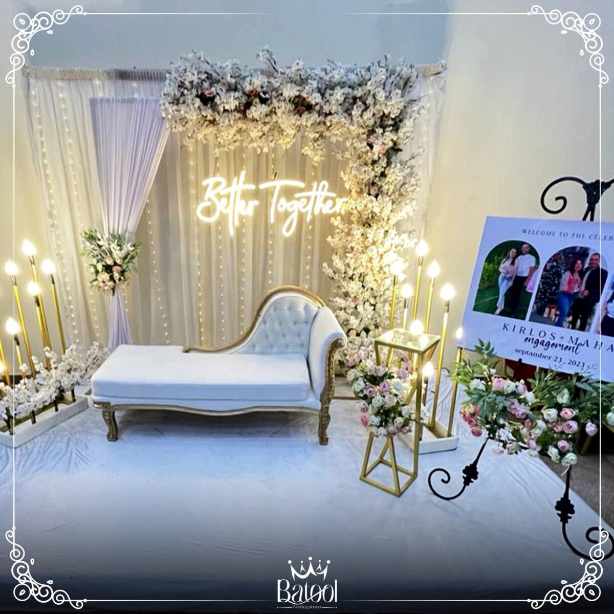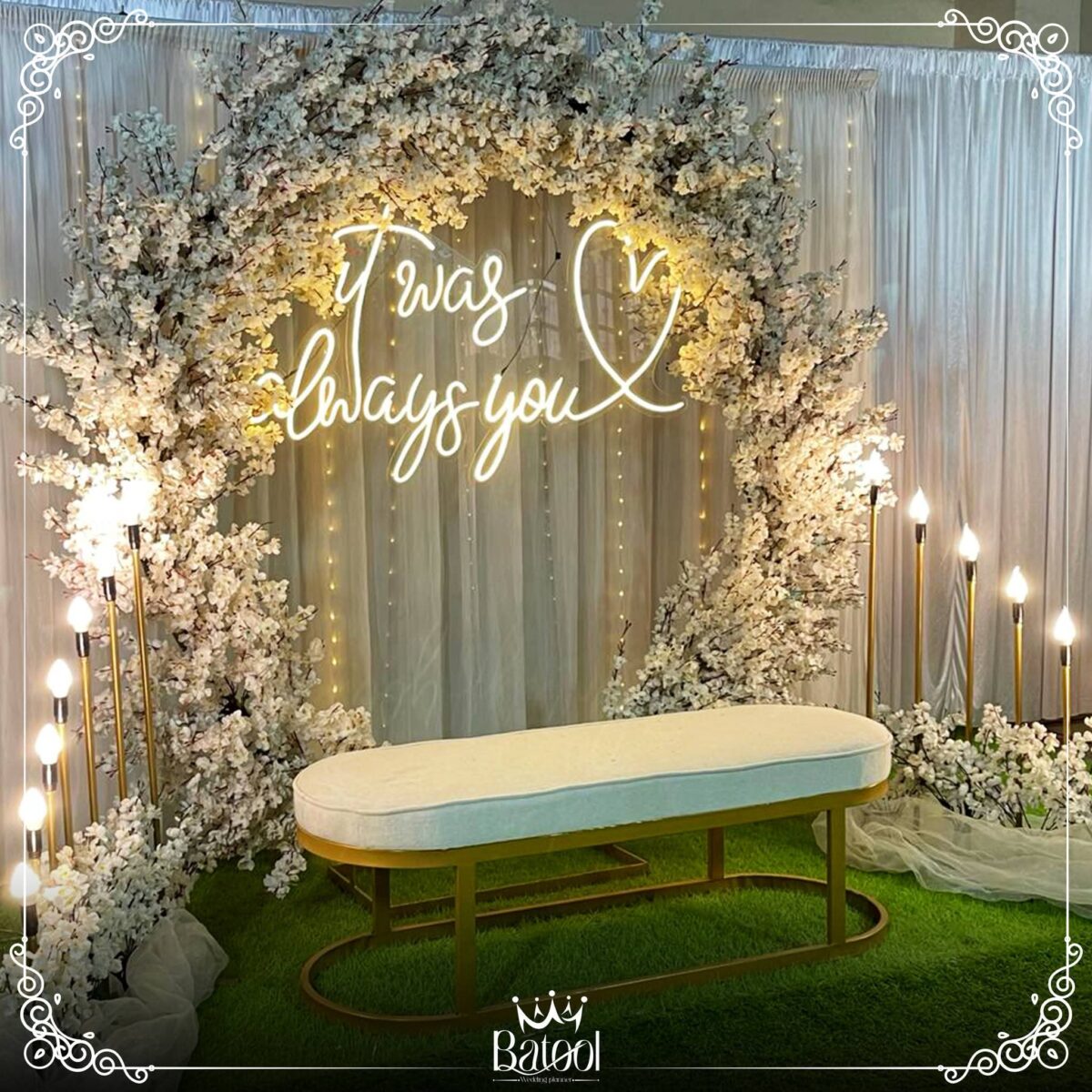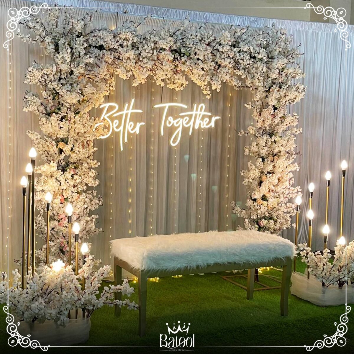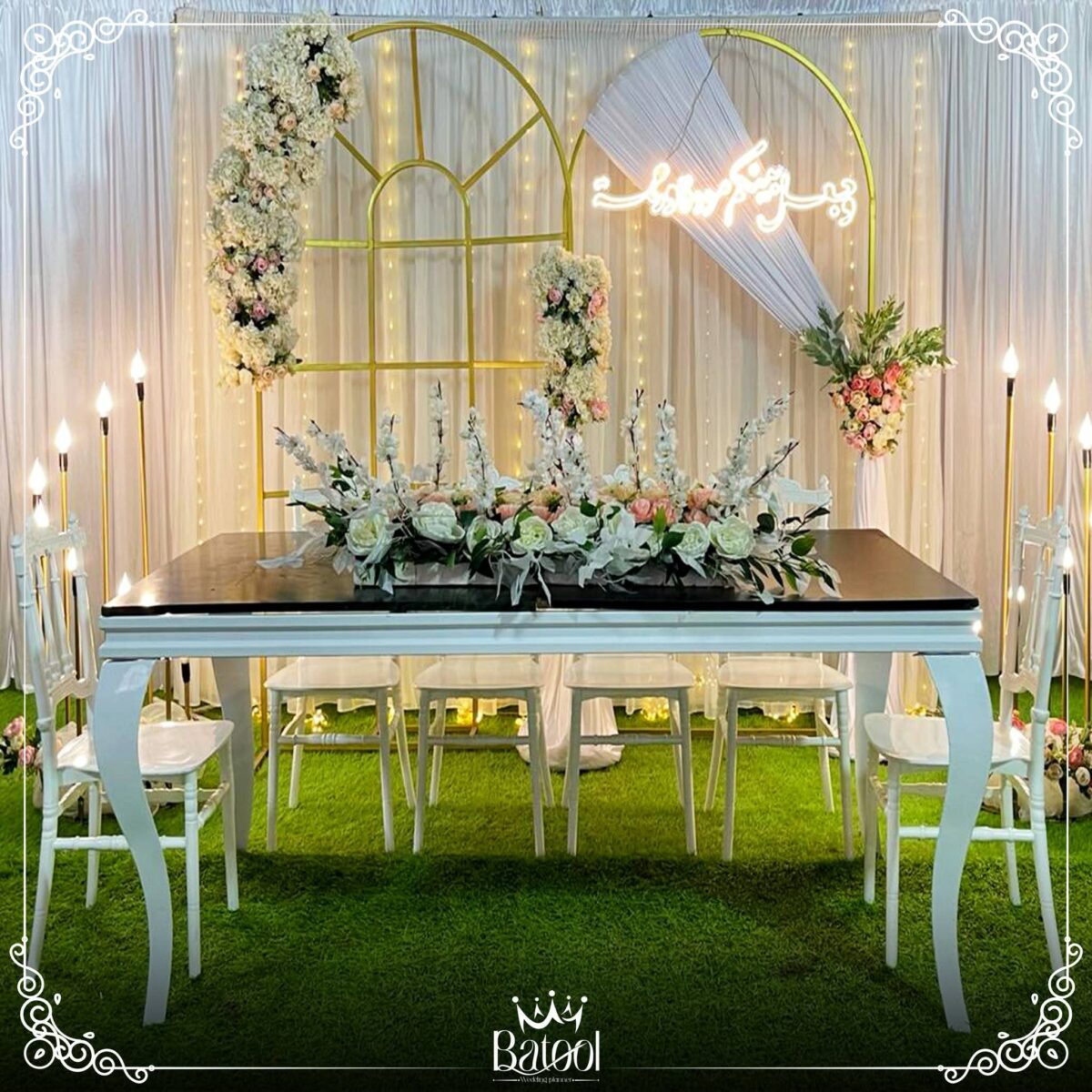 من ناحية الميزانية، Batool بتقدر توازن بين الأناقة والتكلفة. بتعرف تستخدم الخامات البسيطة بطريقة شيك وتقدم بدائل ذكية زي ورود موسمية أو توزيع إضاءة قوية تغني عن ديكورات مكلفة. هدفها دايمًا إن الشكل النهائي يطلع راقي ومناسب لإمكانيات العروسين.