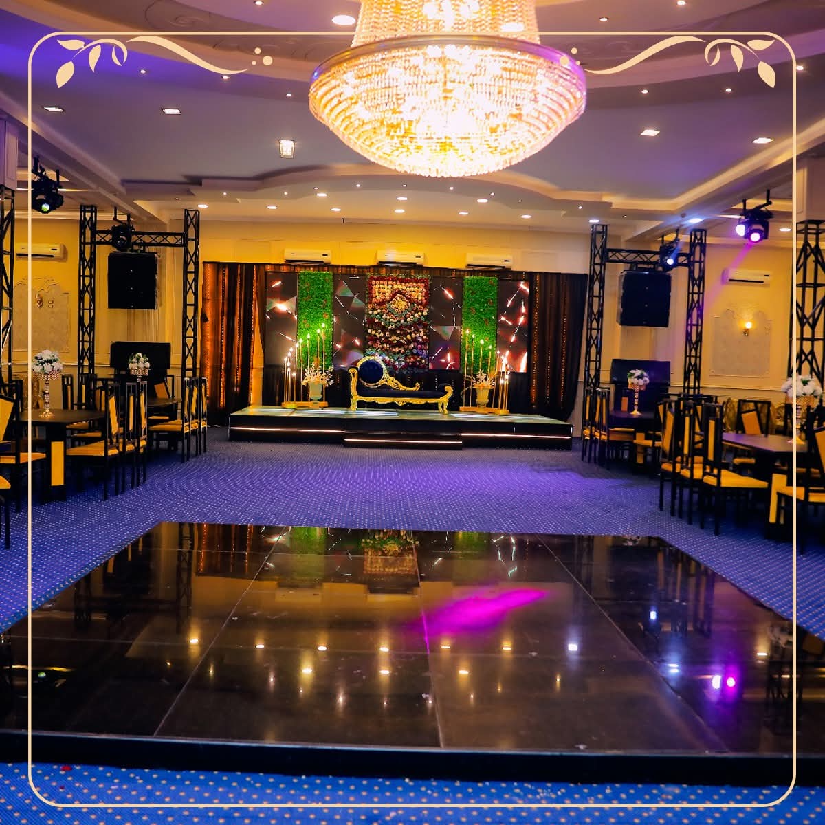 القاعة بتقدم ديكور هادي بألوان متناسقة، وإضاءة مناسبة لكل الأوقات سواء حفلات ليلية أو مناسبات بالنهار. الشكل العام مريح، وده بيخلي الصور تطلع حلوة من غير ما تحتاج تضيف ديكورات إضافية كتير.