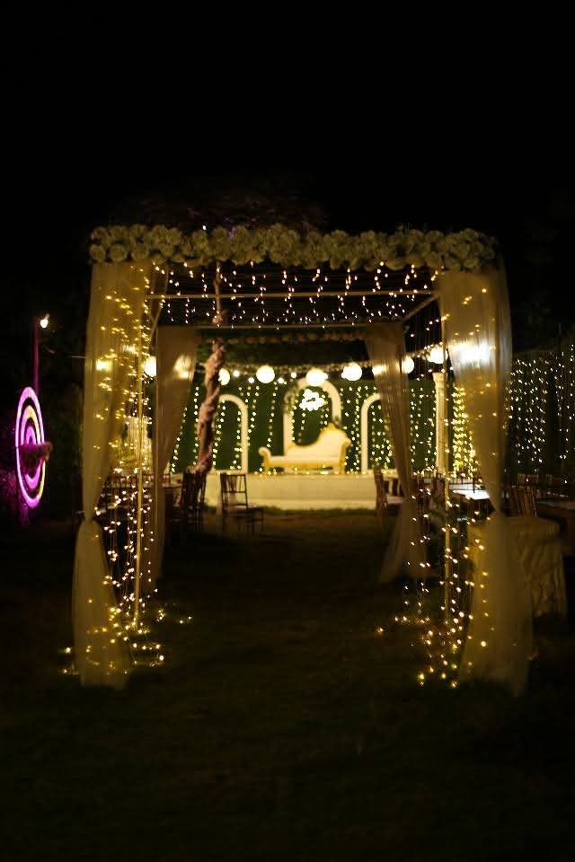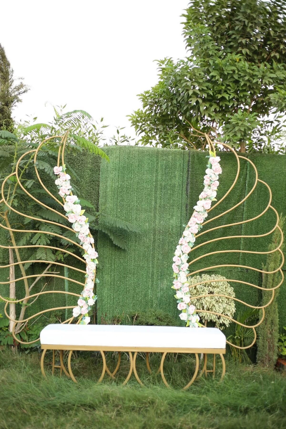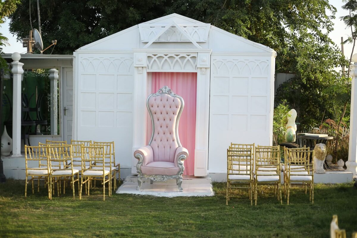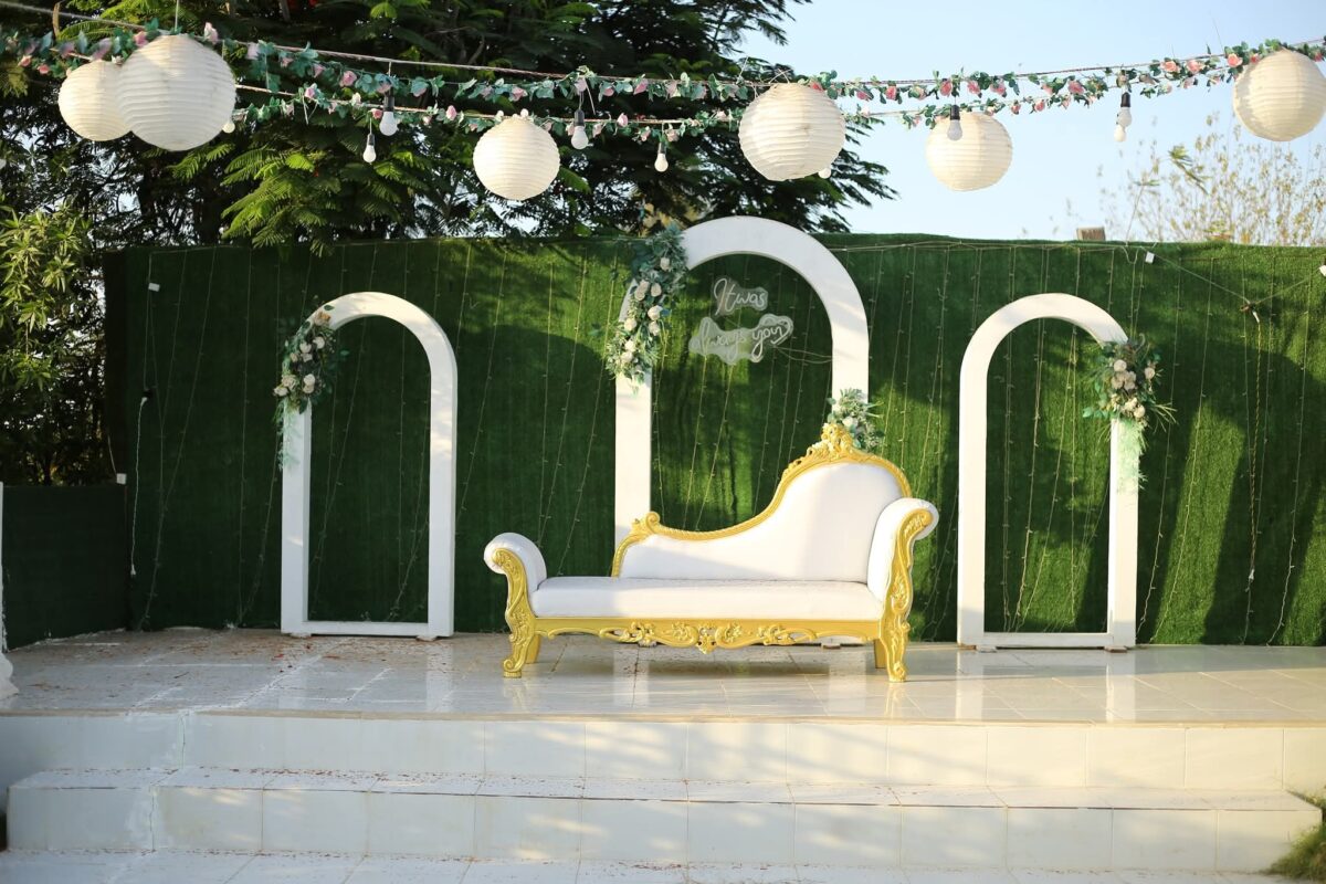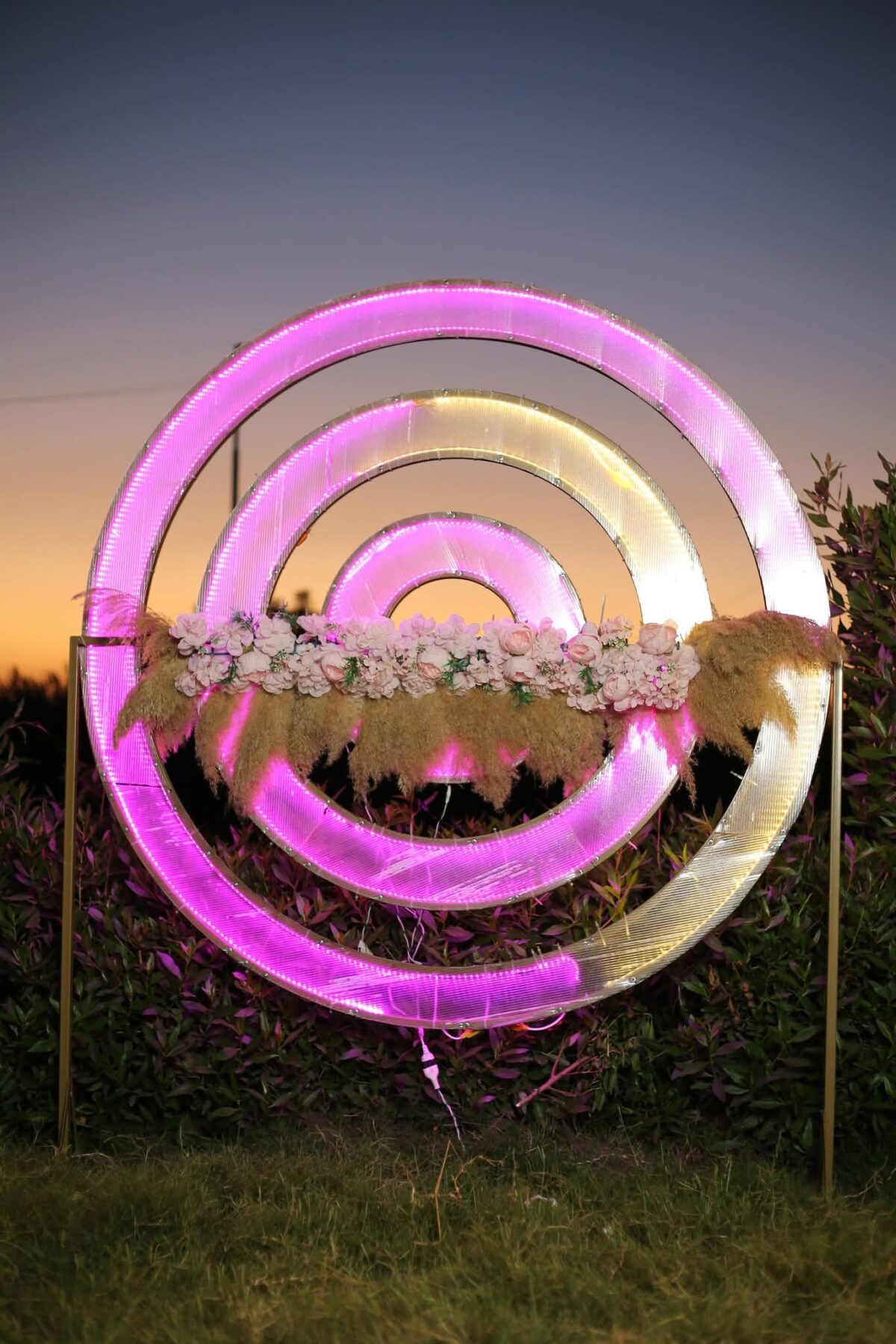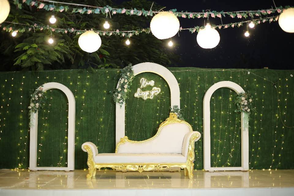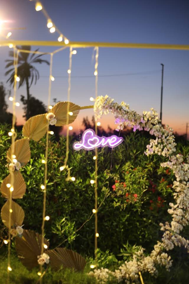 الديكور في Sunset Wedding بسيط جدًا، وده ميزة لو عندك فكرة معينة عايز تنفذها، لأن المساحة بتكون كأنها صفحة فاضية تقدر تكتب عليها اللي تحبه. ممكن تختار بين ديكور بسيط بورد وإضاءة خفيفة، أو تعمل ثيم كامل يناسب ستايلك.