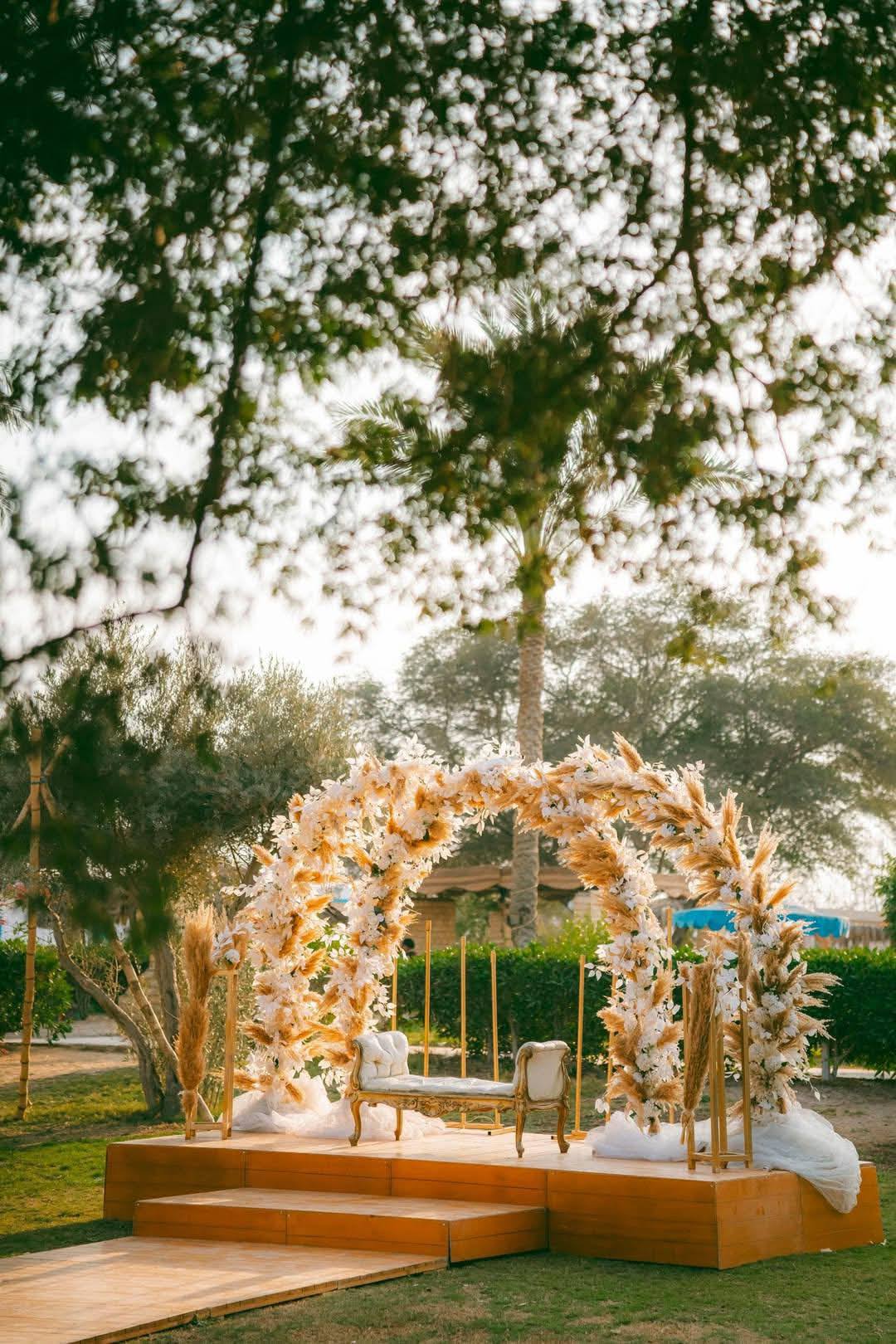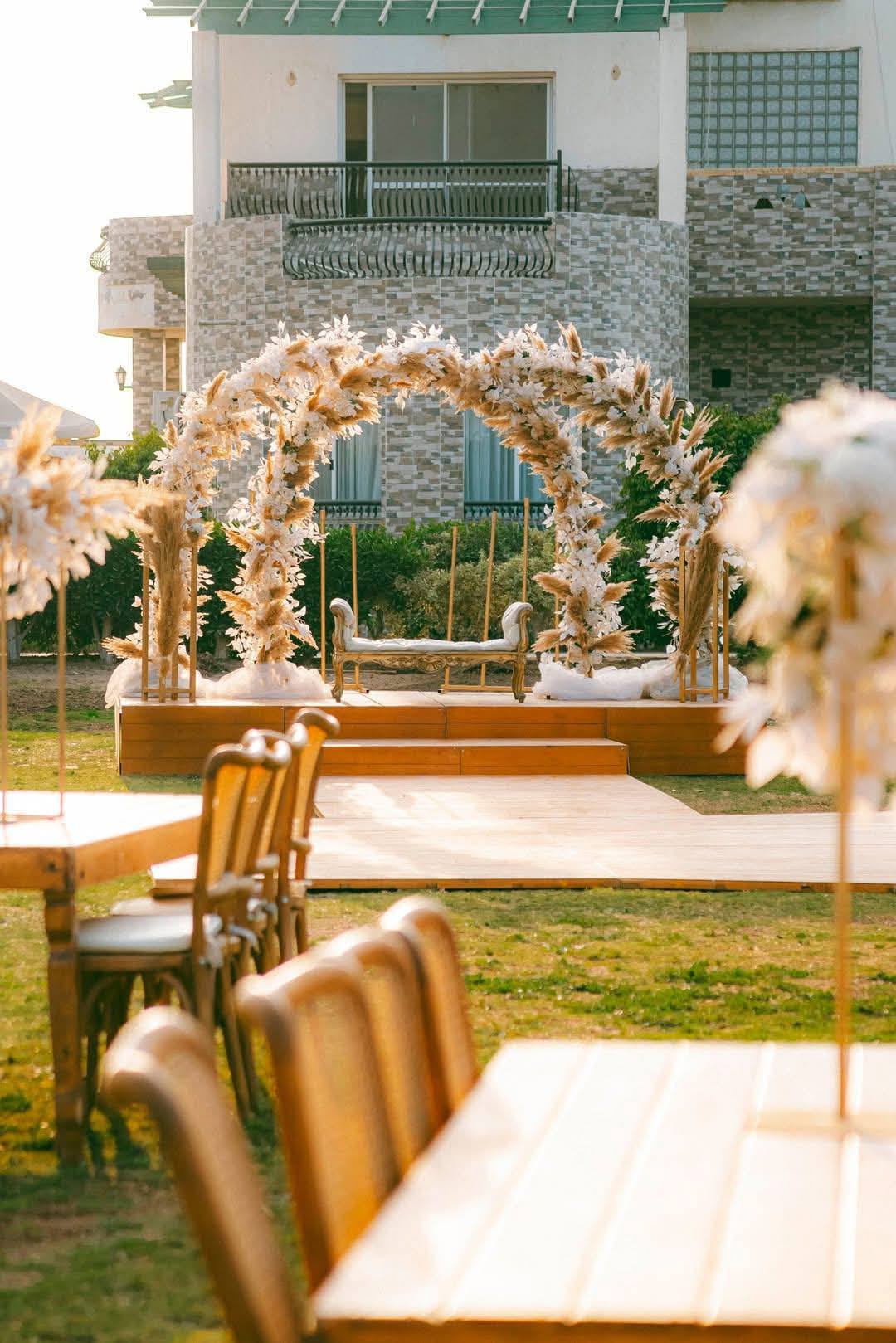 Baron Wedding Villa مساحة مفتوحة ومسقوفة بشويّة مظلّات وحديقة صغيرة بتدي إحساس بالخصوصية المكان متقسم بحيث فيه مكان للكوشة ومنطقة للضيوف ومساحة للرقص أو الفقرات الترفيهية