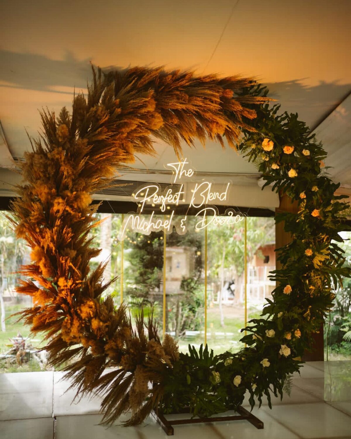 المكان بييجي بديكور محايد من خشب وأقمشة بيضاء وسجاد بسيط فتقدر تضيف لمستك سواء ورود طبيعية أو ثيمات إضاءة معلقة أو ستاندات شمع عشان الجو يبقى رومانسي أو احتفالي حسب ذوقك